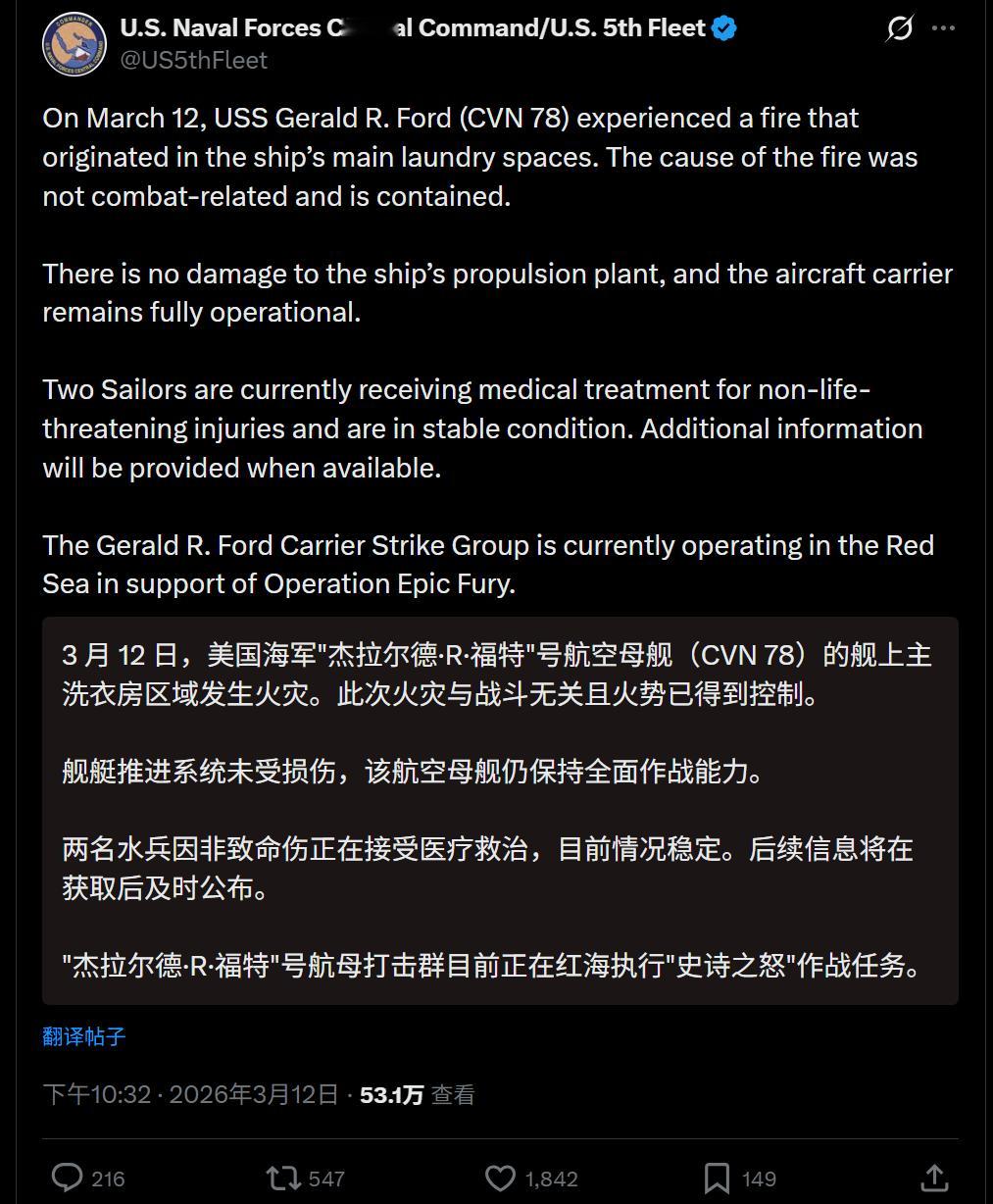 🔻美方称,“杰拉尔德·福特号”航母发生火灾,与战斗无关。🔻2 名美国海军士兵在火灾中受伤。🔻大家信吗?伊朗最高领袖公开声明美国防部被曝龙虾门海外新鲜事中东现场直击