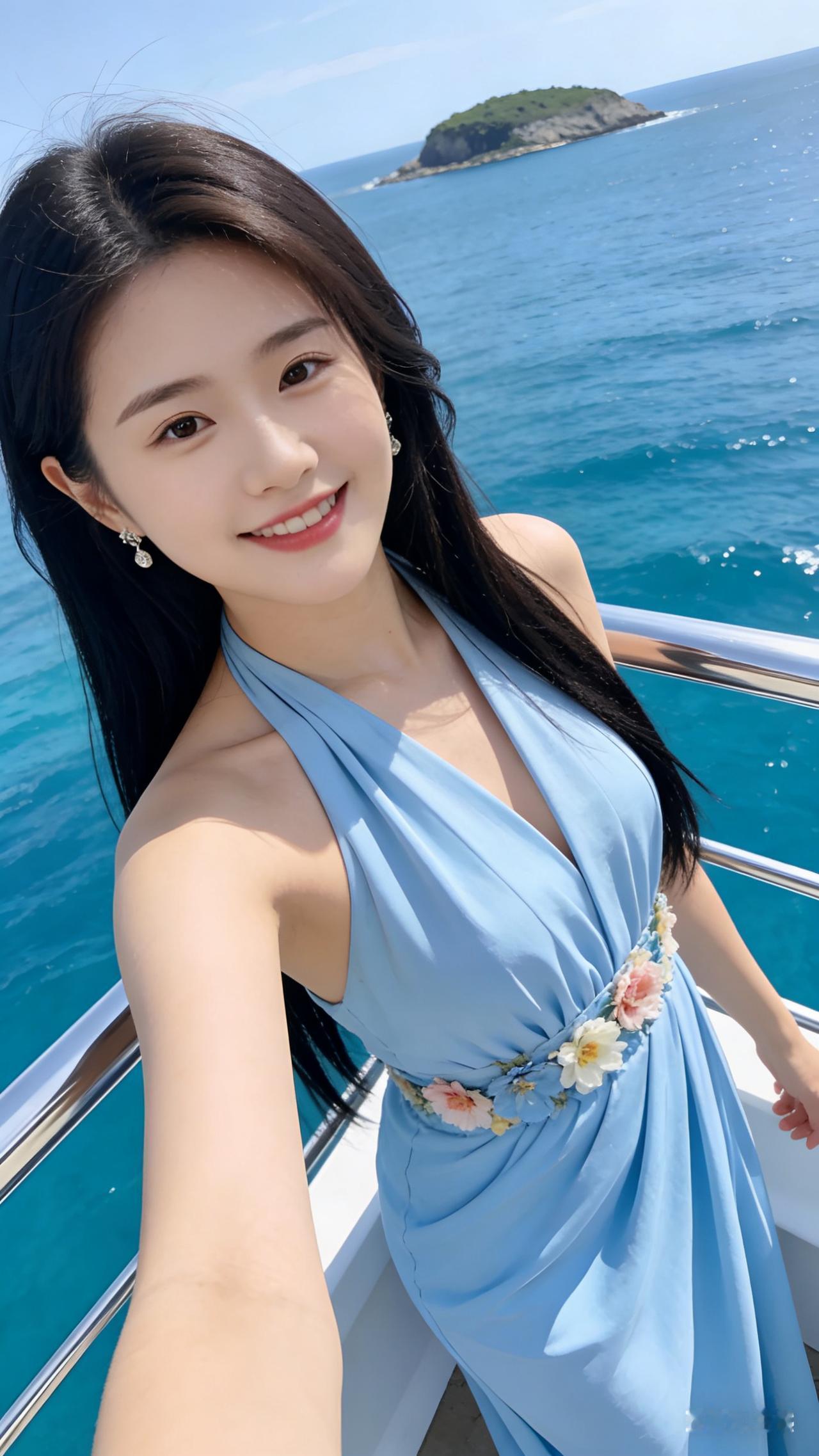 女生身着浅蓝色挂脖长裙,腰间点缀精致花朵装饰,乌黑长直发柔顺飘逸。她立于银色栏杆旁,身后是澄澈大海与小岛,强烈阳光洒在身上,画面清新治愈,细腻唯美。