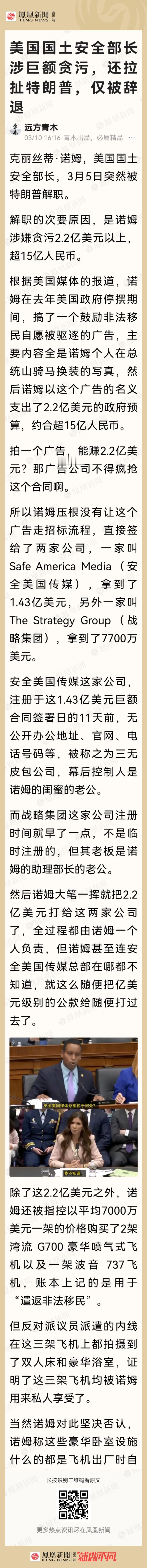 果然是不查就没有贪腐,即使查了也没有贪腐,只有降职,没有惩处一一美国官员的“清廉”是制度化的维护贪腐。美国国土安全部女部长诺姆一一这个打击非法移民、枪杀两名美国人的移民和海关执法局的上级主官,被暴出引起美国舆论轰动的贪腐行为,并在议会听证会上拉特朗普“顶雷”“背锅”,最后居然只是被特朗普降职改任它职,还能平安落地不予起诉。这在中国是不可想象的事情。
