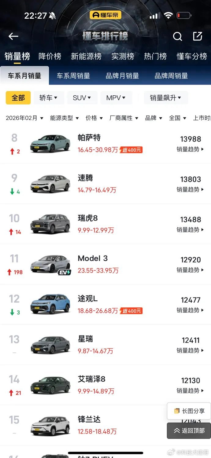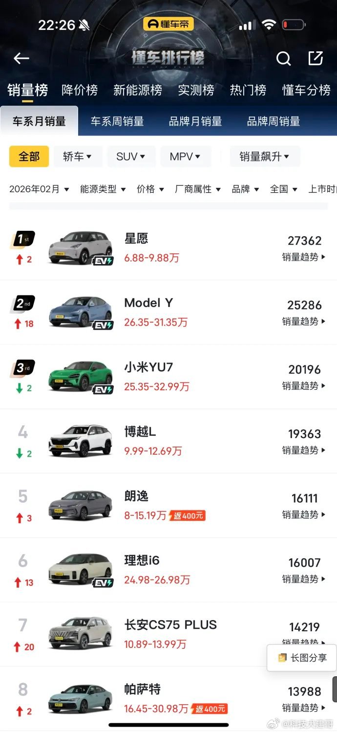 2026年的车市,感觉就是“新能源当道,性价比为王”。要么像小米、特斯拉玩科技和品牌,要么像“星愿”这样把价格打到底。消费者越来越精明,传统车企不加速转型,光靠“情怀”和折扣,以后上榜会越来越难。