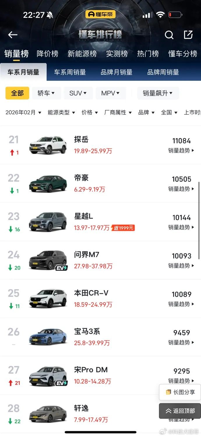 (数据来源:懂车帝2026年2月车系月销量榜)