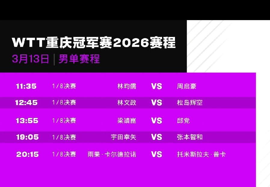 国乒队员共14人参赛,女乒鳗鱼首轮出局,已经回北京休养;向鹏首轮内战甜甜出局;图图首轮2—3惜败雨果出局;黄油首轮内战7号出局!男队小温和楚钦率先晋级八强!女队小曼姐率先晋级八强! 3月13日,Wtt重庆冠军赛 男女单打1/8决赛,国乒赛程 1、13:20,莎莎vs迪亚兹 2、18:30,迪哥vs刘杨子 3、20:50,小石vs同同 4、19:40,陈熠vs斯佐科斯 5、11:35,7号vs林昀儒 6、13:55,甜甜vs邱党 都是硬仗啊!女乒今天还有一场内战!7号和小林子也是魏桥队友,也算是知根知底,但还是希望7号胜出!甜甜跟邱党也不好打,每场都不容易,外协会都涨球了! 莎莎要和她的外协会小闺蜜迪亚兹竞争8强!最近迪亚兹也是在涨球,时不时就会爆发一下,莎莎还是要做足困难准备吧! 一起为国乒加油[点亮平安灯][点亮平安灯][点亮平安灯][加油] 朋友们,你们最喜欢谁,去评论区留言,给他加油! 记录我的2026 乒乓球