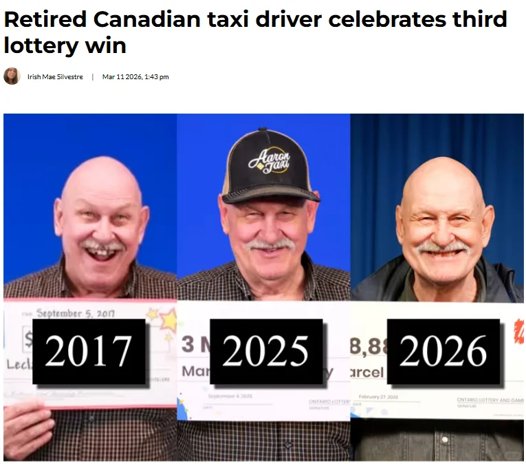 2025年,他又来到安大略省彩票公司(OLG)奖金中心,领取了迄今为止最大的一笔奖金:他只花了30加元买了一张“即时白金刮刮乐”,就中了价值300万加元的头奖。他说自己买这张票是因为它“亮晶晶的,非常吸引人”。