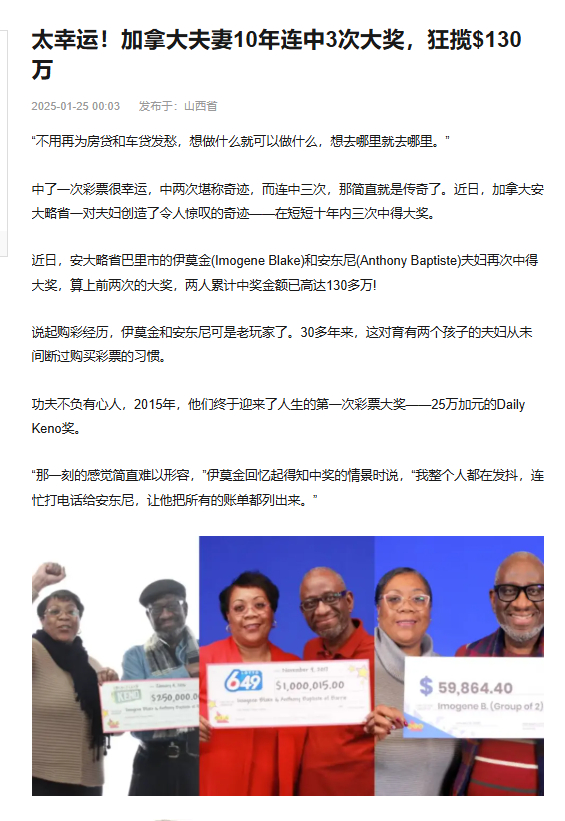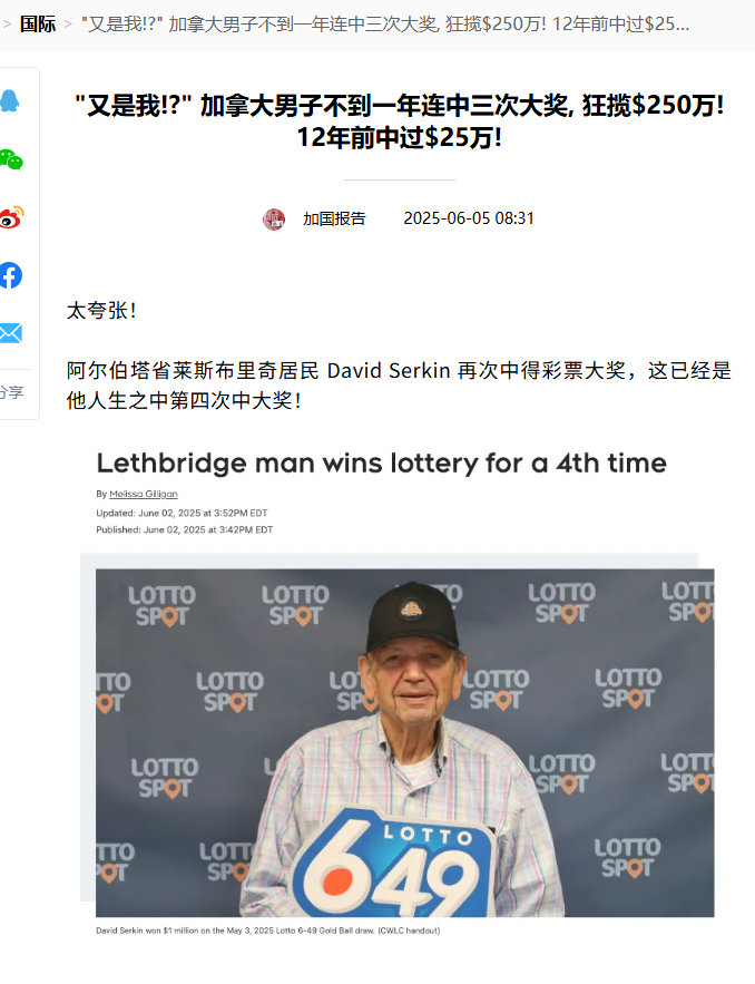 加拿大一男子十年间连中三次彩票大奖,每次给出中奖的理由都很清新…同时,我给大家罗列下加拿大连中三次大奖的其他新闻,加拿大这个地方比较神奇啊,中一次大奖都很难得,偏偏有不少人能连中三元…