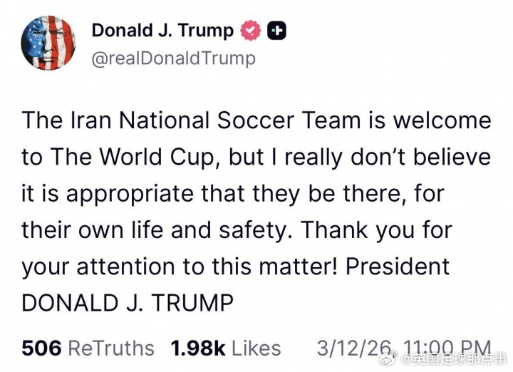 特朗普昨晚发文认为伊朗不适合参加世界杯:“欢迎伊朗国家队参加世界杯,但我确实认为他们不适合参加,这是为了他们自己的生命和安全。感谢大家对此事的关注!”