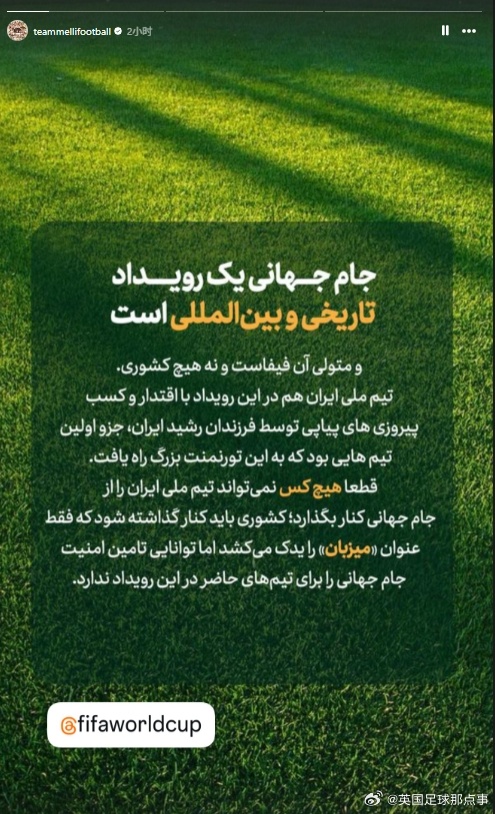 “世界杯是一项具有历史意义的国际赛事,其管理机构是国际足联(FIFA),而非任何个人或国家。伊朗国家队凭借自身实力,以及伊朗健儿们取得的一系列决定性胜利,成为首批晋级这项顶级赛事的球队之一。”