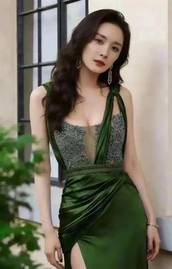张天爱一组薄荷绿挂脖缎面长裙的写真曝光,哑光材质在光线下流动着高级的质感,深V设