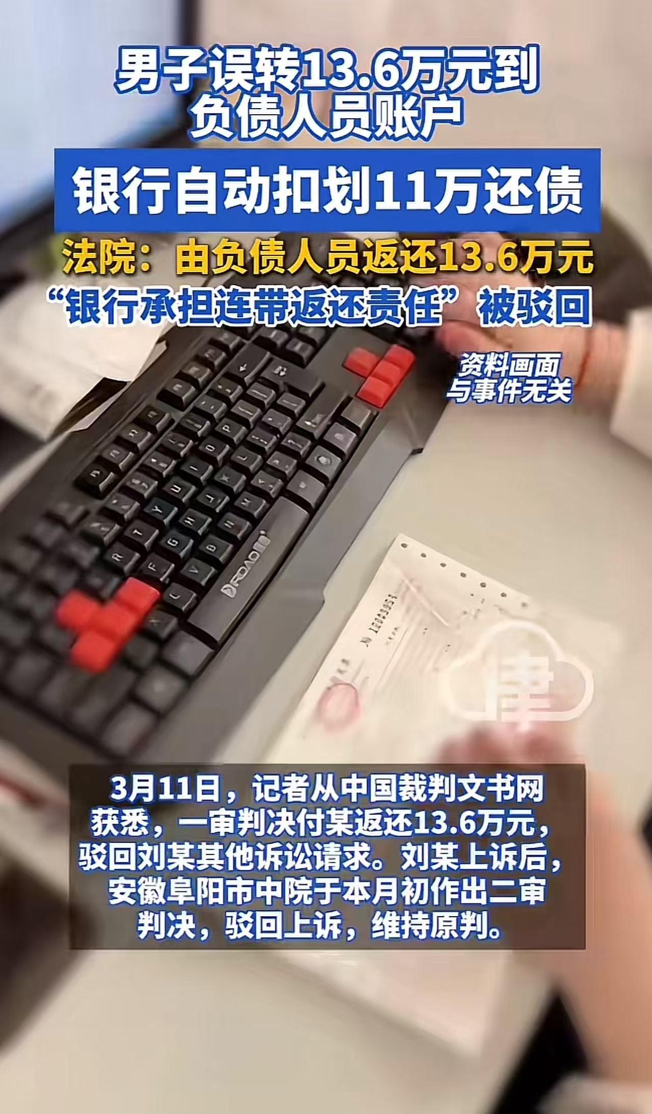 “这钱是我不小心转错,凭啥不还给我?”男子误转13万余元到欠债人员账户,银行自动扣划11万还债!男子认为银行意外“获利”,应该配合把钱返回给自己,但法院判决的让男子目瞪口呆! 老刘是个做生意的老实人,那天急着给供应商付货款。手指在手机上飞快操作,输入金额13.6万,确认收款人。 “叮”的一声,转账成功。 老刘长舒一口气,可没过两分钟,他脑子“嗡”的一下——坏了! 收款人名字差一个字,钱没给供应商,全打进了老付的卡里(之前和老付有经济往来)! 这个老付,可不是什么善茬,是个欠了一屁股债的“老赖”,早就被银行盯上了。 老刘急得满头大汗,赶紧联系老付:“兄弟,我手滑转错了,快把钱退给我!” 老付接到电话,两手一摊,一脸无赖相:“退?我卡里现在连买包烟的钱都没有。钱进来了就是我的,你自己转错的,关我屁事?要钱没有,要命一条!” 老刘气得差点心梗,还没等他反应过来,更绝望的消息来了。 银行系统监测到老付账户突然进账13.6万,二话不说,直接启动自动扣款程序,“咔嚓”一下,划走了11万多,拿去抵了老付欠银行的贷款。 剩下的零头,也被老付迅速取现挥霍一空。 老刘彻底傻眼了。找老付要?老付就是个空壳,要钱没有。 找银行要?银行理直气壮:“这是老付欠我们的钱,钱进了他的账户,我们按合同扣款,天经地义!你转错账是你和老付的事,跟银行无关。” 老刘没办法,只能把老付和银行一起告上法庭。 他的逻辑很简单:这钱本来就不是老付的,是我不小心转错的“不当得利”。银行把这钱扣了,等于白捡了便宜,属于“意外获利”,必须把钱吐出来还给我! 一审法院审理后,认定如下: 第一,老付确实构成了“不当得利”。钱不是你挣的,也不是别人赠予的,是人家转错的,你就得还。所以,判决老付返还老刘13.6万元。 第二,银行没毛病。银行和老付之间有合法的借贷合同,老付欠钱不还,银行有权从他账户里扣钱。至于这钱是哪来的?只要进了老付的账户,在法律上就是老付的资产(哪怕只有一秒钟)。银行扣款有据可依,不构成不当得利,无需承担连带责任。 老刘不服啊!“判老付还钱有什么用?他就是个穷光蛋,这判决不就是一张白条吗?我的真金白银就这么打水漂了?” 他坚持上诉,要求银行必须连带赔偿。 二审法院维持原判,理由依旧硬核:银行的扣款行为合法合规,没有过错。不能因为第三人(老刘)的失误,就让债权人(银行)放弃自己的合法债权。 最终,老刘拿着胜诉判决书,却面临着一个残酷的现实:老付没钱还,银行不用赔,这13.6万,大概率是要不回来了。 【网友热议】 “负债人都不具备对这个钱的支配权,银行凭什么来支配这笔钱,虽然这笔钱暂时在负债人卡上,但事实认定并不是负债的的钱,银行有什么权利支配别人的钱,可能合法但是一定不合理,违背道德!” “银行是如何立于不败之地的?如果条约不能约束双方,要条约何用?” “大概率是负债人可能有别的收款渠道,付钱的人不小心搞错了,又按照老渠道打过去了,然后想着用转错的名义把钱要回去,省得被法院收了!” “如果是一笔黑钱,创造一个负债人账户,然后转给这个账户,然后银行自动扣款,是不是就洗白了?” 【事件看法】 别拿“我觉得不公平”去挑战“法律的铁律”;在这个规则至上的社会里,你的粗心大意,没人有义务为你买单! 这起案件,看似是银行“冷血”吞钱,实则是给所有人上了一堂昂贵的风险教育课。 很多人觉得银行“不道德”,是因为他们站在受害者的角度,看到了老刘的损失。 但在法律的天平上,银行的债权是确定的、合法的;而老刘的损失,是由自己的过失造成的。 钱一旦进入老付的账户,在那一瞬间,它就是老付的财产。银行执行的是对“老付财产”的合法追偿。 如果因为钱是“转错”的,银行就不能扣,那岂不是意味着所有欠债的人,只要有人转错账给他们,这笔钱就成了“避难所”,债权人都不能动?那社会的信用体系还要不要了? 银行也是商业机构,它的每一笔扣款背后都是无数储户的信任和严格的合同契约。 这种“谁弱谁有理”、“谁惨谁有理”的思维,才是对社会公平最大的破坏。 在数字化支付的今天,手指轻轻一点,就是真金白银的流动。 核对收款人、确认金额,这是最基本的生存技能,而不是可有可无的繁琐步骤。 当你把十几万轻易转错时,你就已经为自己的疏忽埋下了单。 法院的判决虽然冷酷,却是在捍卫一个朴素的真理:每个人都要为自己的行为后果兜底。 在这个世界里,唯一能保护你钱包的,不是法官的同情,而是你转账前那多花的一秒钟核对。 毕竟,13.6万的教训,真的太贵了! 来源|津云