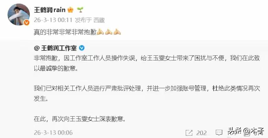 当面喊老朋友,背后骂王玉雯“太肿太蠢”,王鹤润本人实名认证大号发出来的评论,直接把内娱塑料姐妹情的遮羞布撕得稀碎。 3月12日晚,有网友发博讨论王玉雯新剧《刺棠》的古装造型,王鹤润的官方认证账号直接在这条博文下留了评论:“她古装太肿太蠢了,真的一点不灵气”。 这话一出瞬间炸锅,核心根本不是吐槽明星造型,而是两人的关系——王鹤润和王玉雯根本不是陌生人,不仅合作过综艺,2025年11月还刚晒过贴脸合照,公开以“老朋友”相称。 人前和和气气,人后却用自己的大号公开贬损,这种反差,直接被网友吐槽是“内娱塑料姐妹情实锤”。 就在舆论持续发酵时,IP属地的细节先让事件出现了转折。发布争议评论的账号IP属地为上海,可王鹤润当时正在西藏录制综艺《种地吧》,她当天18:20刚发了西藏的风景动态,后续道歉微博的IP属地也全程显示为西藏。两地相隔数千公里,往返最短也要7个小时,根本不可能是她本人操作。 事发两小时后,也就是3月13日凌晨,王鹤润工作室火速发布致歉声明,将事件归因于“工作室工作人员操作失误”,称已对涉事人员严肃批评处理,会加强账号管理,同时向王玉雯致歉。 五分钟后,王鹤润本人转发了这份声明,连用三个“非常”致歉:“真的非常非常非常抱歉”,后续还在评论区补充“确实没有任何理由和借口,真的很抱歉”。 可这份看似反应迅速、态度诚恳的道歉,非但没平息舆论,反而引发了更广泛的争议。 有网友觉得,IP属地的证据链完整,确实是工作人员的失误,没必要揪着艺人本人不放;但更多网友直言不买账——“工作人员操作失误”这六个字,早就成了内娱公关的万能挡箭牌,手滑点赞、切错号、发错引战内容,不管闯了什么祸,最后永远是底层工作人员出来背锅,这套说辞,网友早就看腻了。 其实大家真正反感的,从来不是“手滑发错评论”这个乌龙本身,而是事件背后两个绕不开的核心问题。 其一,就算真的是工作人员操作失误,能说出这么直白的贬损之语,难免让网友猜测:这是不是团队私下里就有的论调?不然一个工作人员,绝不会平白无故用艺人的实名认证大号,去吐槽和艺人交好的同行。 其二,艺人的实名认证账号,本就该有严格的管理规范,如今却能被工作人员随意用来发布不当言论,这本身就是团队的巨大管理失职,最终给无辜的王玉雯带来了无妄之灾,一句轻飘飘的“工作人员失误”,根本担不起这份责任。 更有意思的是,从头到尾,被吐槽的王玉雯及其团队,全程保持沉默,没有做出任何公开回应。一边是连夜道歉、急着灭火,一边是全程沉默、不接茬,这场面反倒比那条争议评论本身更尴尬。 说到底,这件事从来都不只是一句“手滑”的乌龙。它捅破了内娱两层最常见的窗户纸:一层是人前亲密、人后非议的塑料同事情,另一层是闯了祸就把底层工作人员推出来挡枪的万能公关套路。 账号可以道歉,失误可以甩锅,但艺人的口碑和路人缘,从来不是靠模板化的公关话术就能守住的。 你觉得这条评论真的是工作人员发的吗?你能接受内娱这套“工作人员背锅”的公关说辞吗?评论区聊聊你的看法。