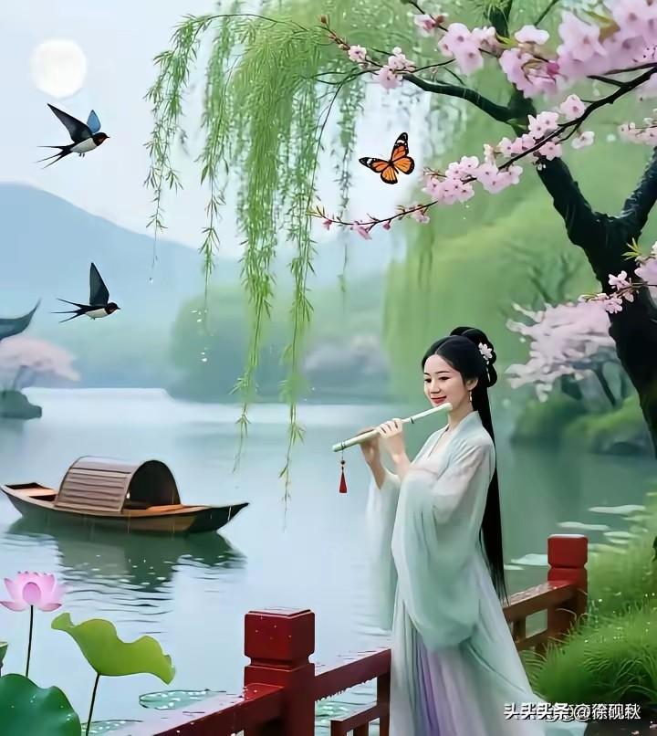 雾蒙湖面柳丝柔, 绿伞佳人立桥头。 满眼青翠藏心事, 相思离愁亦烦忧。