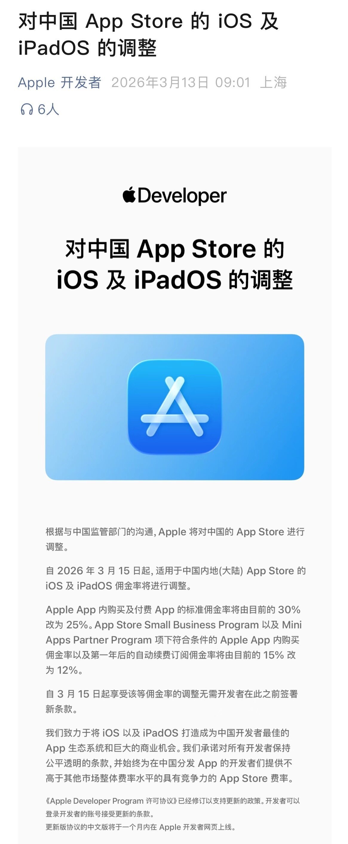 苹果税下调 Apple宣布自2026年3月15日起,对中国的App Store的iOS及iPadOS佣金率将进行调整,App内购买及付费App的标准佣金率将由目前的30%改为25%。虽然我们平时为了避免这个多余的30%,都会选择在其它方式购买,但这个下调确实能减轻那些购买者的费用,曾经我也付过这样的冤枉钱,后来都会特别的慎重了!