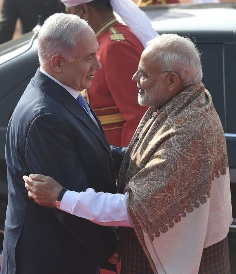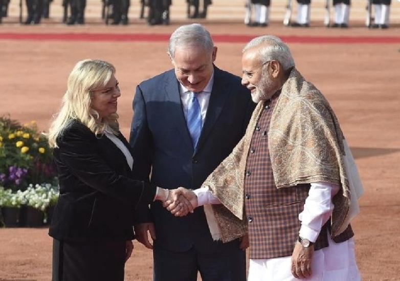 莫迪和内塔尼亚胡夫妇见面的场景。 莫迪和内塔尼亚胡的拥抱,像久别重逢,千言万语不知从何说起; 莫迪紧紧握住萨拉的手,内塔尼亚胡低头默默的看着这一幕,说了句:兄弟,注意分寸,这位是你嫂子。 莫迪的太过热情,真让人哭笑不得。