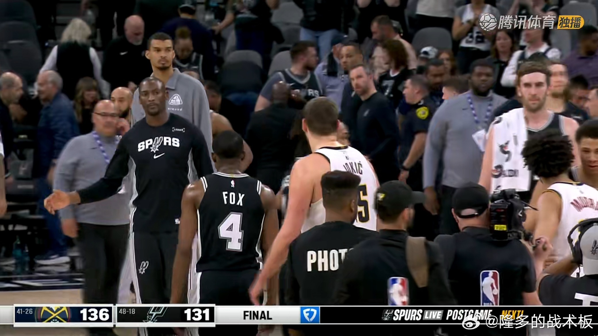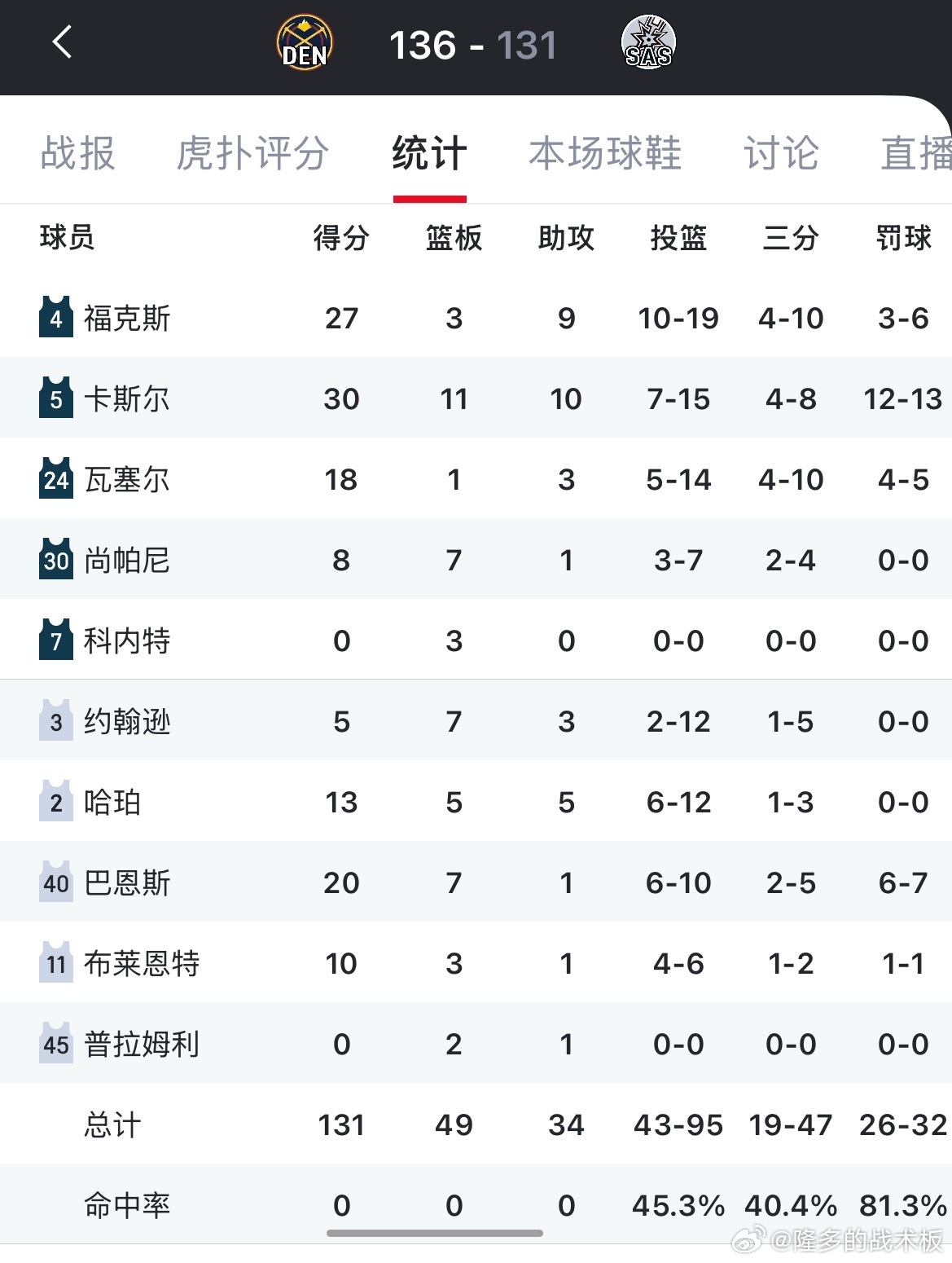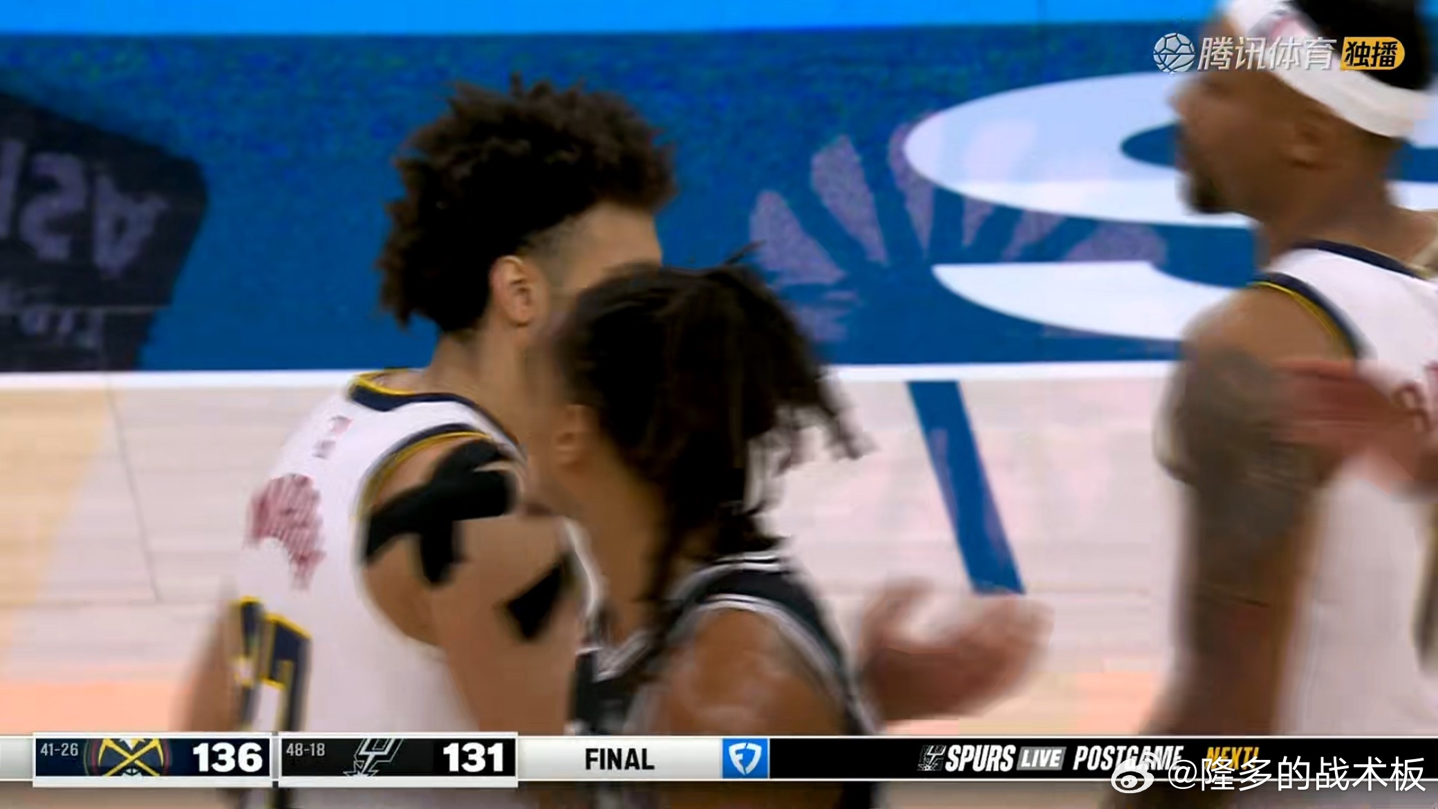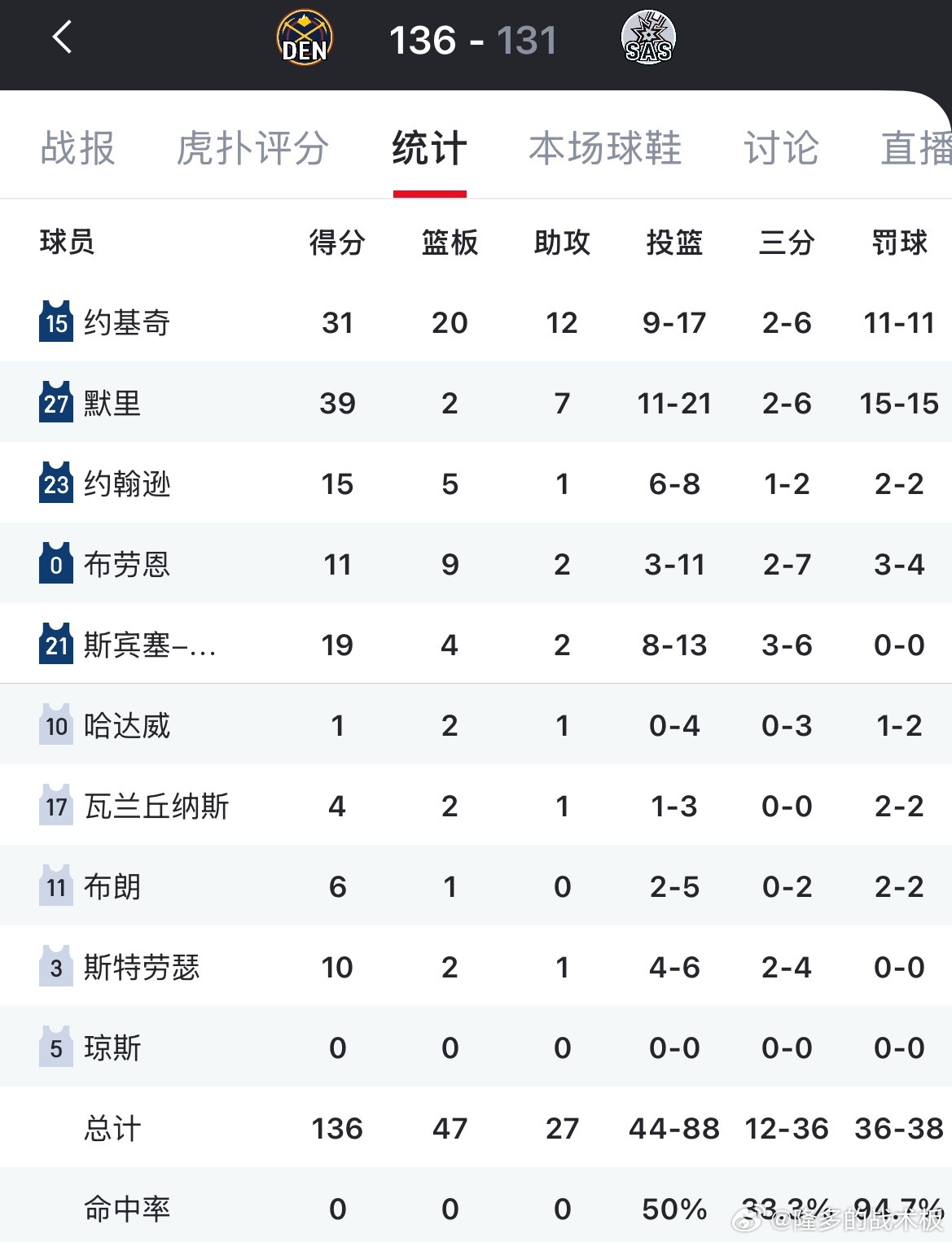 约基奇31+20+12大号三双,掘金末节逆转马刺,胜场差暂时追平湖人。