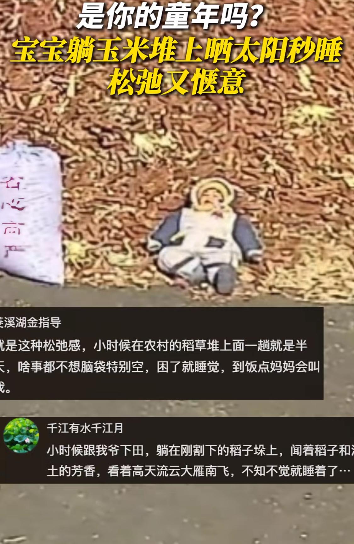 22个月大的宝宝火了!吉林,一女子将宝宝送到姥姥家住,这天,女子突然想宝宝了,便打开姥姥家监控想看看孩子,结果看到孩子在院子里晃晃悠悠地走着,然后一下子就躺在玉米瓤子上开始晒太阳! 孩子躺下的那个动作特别逗,看着像是玩累了,觉得脚底下那堆东西软和,就顺势躺倒了。这个年纪的小孩就这样,走路还带着点摇摇晃晃的劲头,想到什么就做什么,没什么复杂的道理。 玉米瓤子就是玉米脱粒后剩下的芯,在东北农村秋天到处都是,晒干了堆在墙角。那东西确实挺适合躺的,有弹性,不硌人,还有点保温。我小时候在外婆家,也爱往柴火垛上躺,闻着那股干草和粮食晒过的味儿,觉得特别踏实。 这个季节在吉林,中午前后的太阳晒着正舒服,暖和又不毒。小孩多晒晒太阳挺好的,能补钙。我有个儿科医生的朋友总说,让孩子在户外自然光下活动,比在屋里吃补剂强。 监控里没看到姥姥,但我觉得老太太肯定就在不远的地方忙活,比如在屋里择菜或者隔着窗户看着。老人带孩子有自己的一套,不会老跟在屁股后面,而是给划个安全的范围让孩子自己玩,这样孩子反而更自在,胆也大。 现在城里的小孩,难得有这么接地气的时候。出门怕脏,怕磕碰,玩什么都要先消毒。你看这孩子在自家院子里,衣服脏了洗洗就行,晒得脸红扑扑的,看着就健康。这种和土地、阳光直接接触的玩耍,对孩子身体协调和感知能力其实特别好。 当然,大人心里还是得有根弦。得确保孩子躺的玉米瓤子是干净、没发霉的,不然怕引起皮肤过敏。也得看着点,别让他好奇把碎渣子往嘴里放。安全永远是第一位的。 当妈妈的通过监控看到这一幕,心里肯定是暖洋洋的,但又有点不是滋味。孩子玩得开心,可自己不在身边。好在现在有手机,能随时看看,也算是一种安慰。我姐在国外工作,就常这么干,说看看家里的监控,心里能踏实点。 看着这孩子无忧无虑晒太阳的样子,倒让人想起自己小时候。长大了,各种事情压在身上,很难再有这种“天为被,地为席”的纯粹放松了。孩子的这种简单和快乐,其实挺珍贵的。