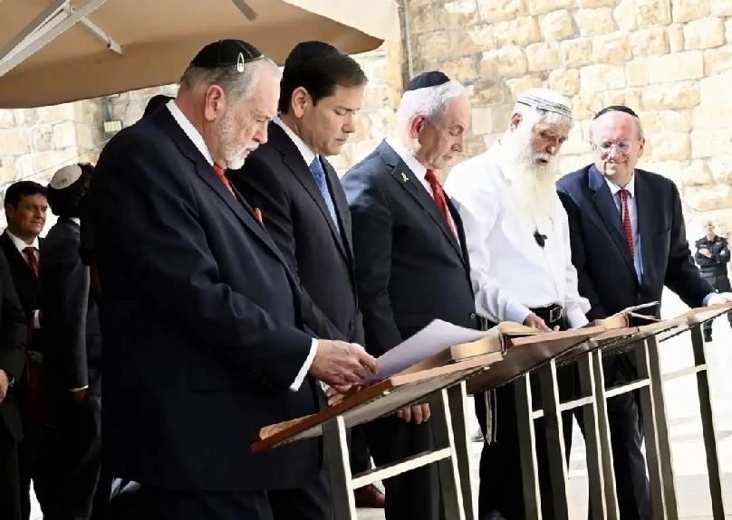 内塔尼亚胡几个人的头上戴着小帽子,他们的表情很肃穆; 最右边男人的小帽子上还别着一个小卡子,是看点; 合影中萨拉的个子最矮,但她挺受关注的,因为她的丈夫是内塔尼亚胡。