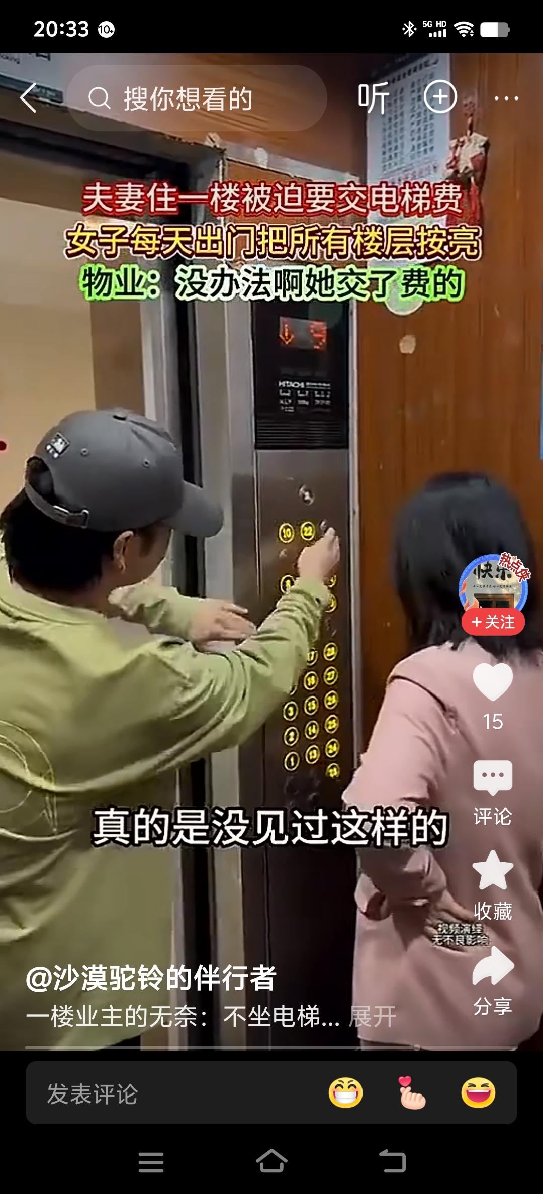 电梯就是立体公交车,一楼不应该交电梯费 看到有说一楼业主把从上到下电梯按钮都按了,因为是付了电梯费。因此每当上班上学高峰时,较真的一楼业主出现全按情景剧,迟滞电梯运行,这是大家的无奈,但也是他自己的权利。 电梯是一个什么东西?把电梯想象为公交车,立体公交车,它是业主离家、到家的开始或者是最后一站,需要乘坐的时候付费,是不是问题就比较简单了? 安装电梯或者是原已有电梯的管理,本身就是一个公平服务,或者是运行起来方便业主的东西,而不是添堵,制造矛盾。 比如新安装电梯就应该是谁使用谁付款?对楼体安全出现问题或其他安全问题,后续的维护更新,甚至日常电费,都应该由参与的业主负责,而不是把不同意、不使用的业主拖进来。毕竟民主不是绑架,2/3举手不是可以伸手掏人家的钱包,绝不允许任何以民意裹挟其他业主的行为。 曾经看到个报道,北京某地有让一楼业主拿电梯电费的例子,就同此画面,如出一辙,就表明由于围绕电梯产生的矛盾是大量存在的,需要谨慎处理,避免激化矛盾。 公交公司不会因为乘客坐公交车,还需要乘客花钱去买公交车。电梯也是如此,如果把电梯当做立体公交车,只负责把业主送到目的地,而业主只需要掏这一段的费用即可。用这个公交车与电梯做比喻,是不是豁然开朗了。 一卡解决问题。至于乘坐电梯个人怎么刷卡,怎么管理,怎么能做到每一个人能真正付费,像公交车那样,那就是科学技术上的问题了,就是管理服务上的问题了,就是道德素质上的问题了。 所以回到一楼业主这里,如果这个楼的一楼不通不去地下车库,根本就是零使用电梯,那么电梯上的任何事情都不应该找一楼负责,不能说他是这个楼的业主,这个楼的资产和他家房屋绑定在一起,就要负责全楼的任何事情。而旧楼新装电梯更是如此,不仅是一楼了,不愿意参与的业主都不应该有责任。 当一楼楼业主时不时在人多时把电梯按钮上从上到下噼里啪啦摁到二十几楼的时候,一卡问题解决不了,又实在是受不了,经常耽误大家上班上学时间,还是楼上业主把一楼的费用分摊了吧。 一楼住户该不该交电梯费