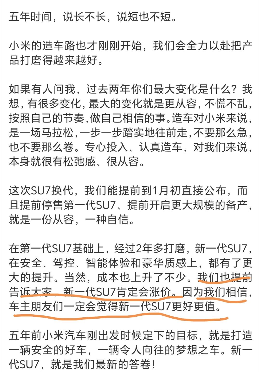 雷军称新一代SU7肯定会涨价 雷军坦言新一代SU7成本上涨,价格会更高。两年打磨,在安全、驾控、智能、豪华感上全面提升,直言更好更值,看来产品力确实有大突破。