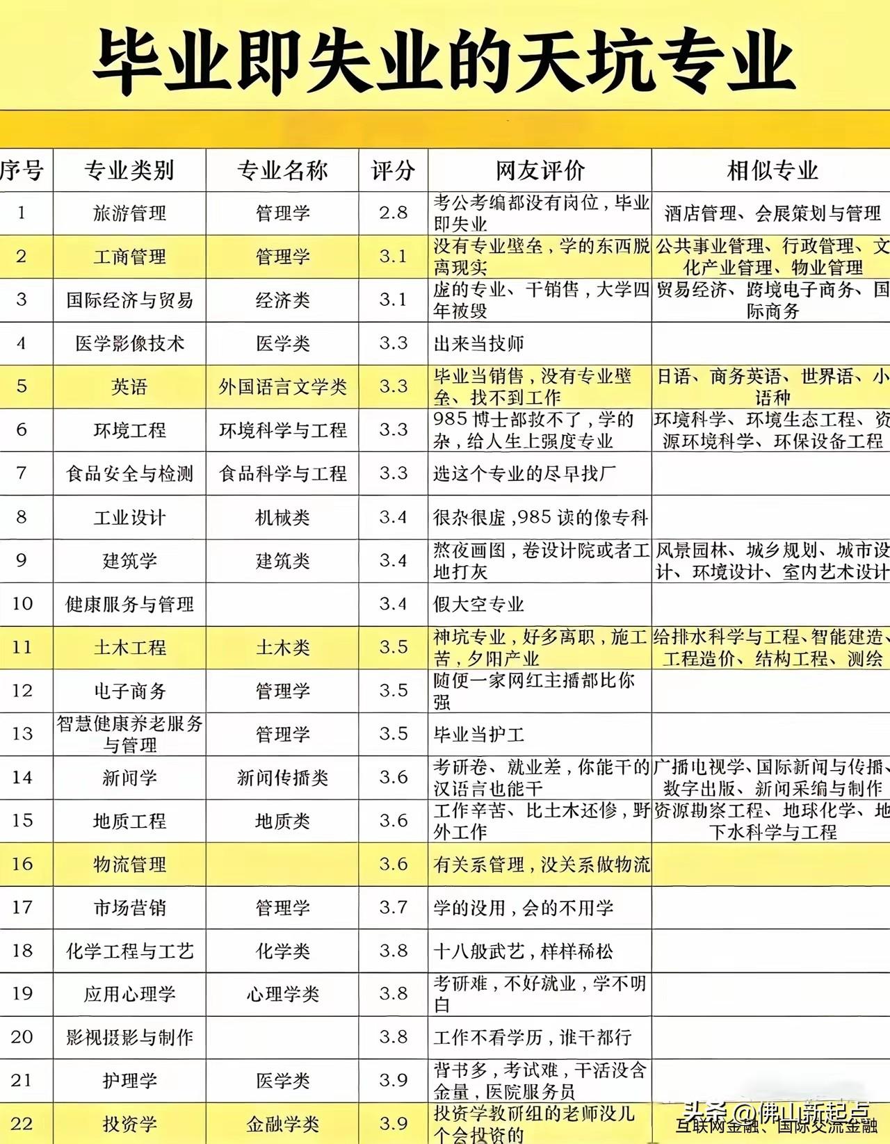 现在社会发展快,有些专业和社会脱节成了“天坑”。就拿土木工程来说,曾经它可是热门专业,研究道路、桥梁、建筑等基础设施。但如今它被贴上“天坑”标签,原因主要有这几点。 一是就业前景堪忧,行业发展遇瓶颈,市场趋于饱和。二是工作环境恶劣,土木工程师要在施工现场监控进度、处理问题。三是课程陈旧,所学知识可能跟不上实际需求。 曾经的“生化环材”天坑专业,现在就业率能达80% - 90%,撕掉了天坑标签。选专业真得紧跟社会发展趋势,不然就容易掉进“天坑”。
