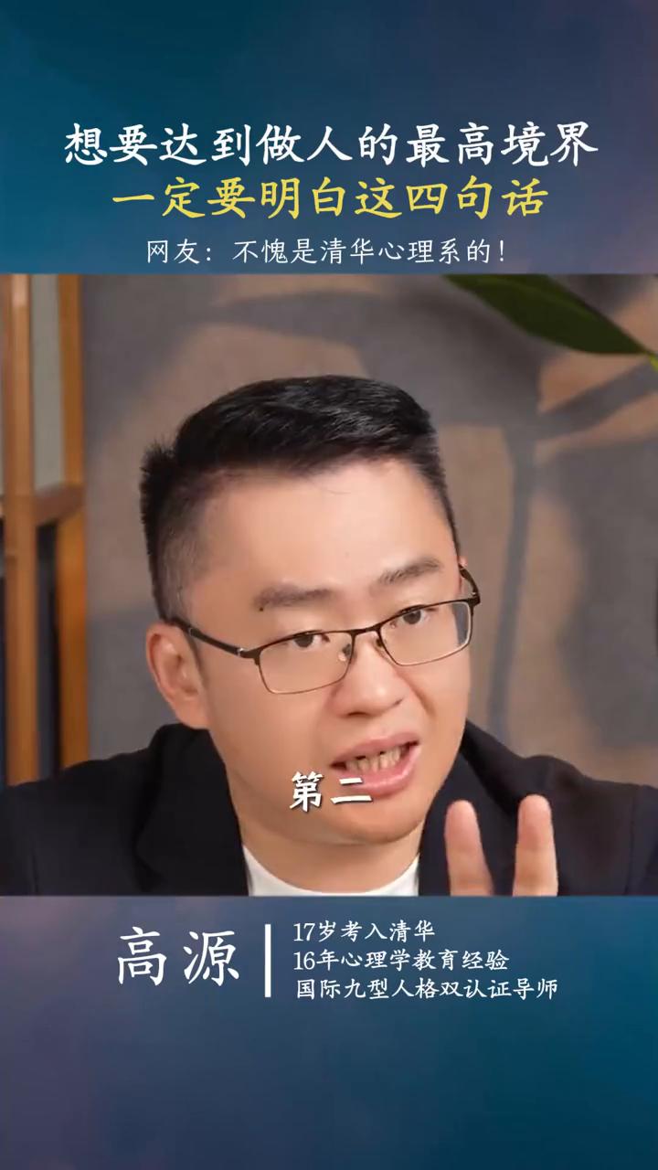 想要达到做人的最高境界,一定要明白你这四句话。 高源,16年心理学教育经验,国际九型人格双认证导师。 真正活到最高境界的人都会明白这四句话: ·第一,人生真正的贵人是自己。 ·第二,人生最大的胜利是成功的战胜自己。 ·第三,人生最大的幸运是学会了拯救自己。 ·第四,人生最美好的事是遇见更好的自己。 其实爱的最高境界就是爱上了自己,自己就是一切的根源,一切因你而起,一切因你而来。