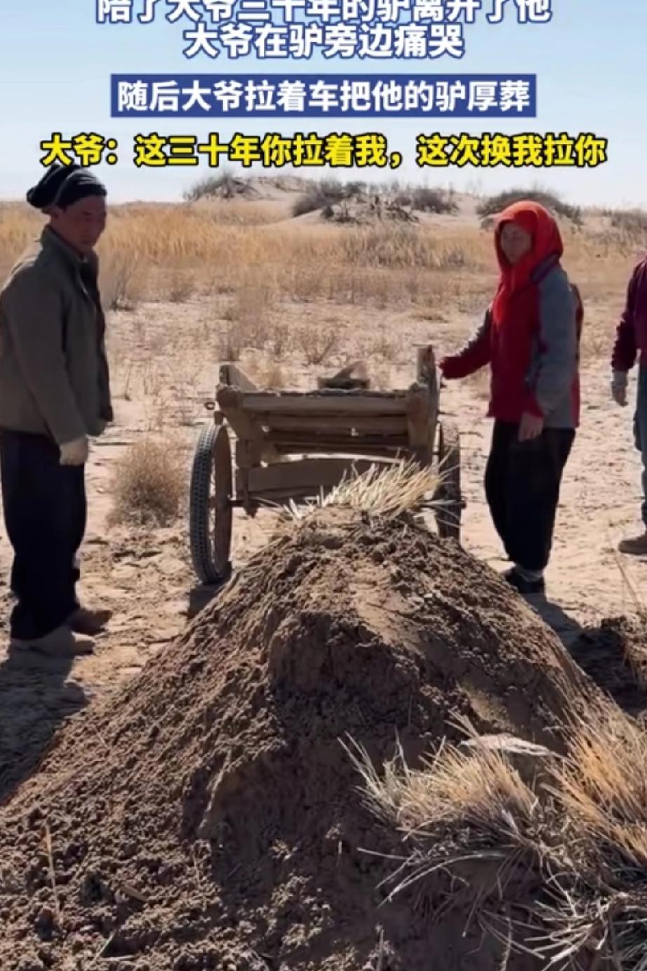 这次,大爷哭的好伤心! 陪了大爷三十年的一头驴离开了他,大爷守在旁边哭的像个找不到妈的孩子,虽然是动物,毕竟是大爷每天喂养它,其中的感情只有大爷深有体会,三十年的陪伴今日一别再无归期,大爷做了一个决定,把驴厚葬,随后用小拉车依依不舍的拉着它去埋葬,边走边哭着说:“这三十年你拉着我,这次换我拉你” 其实人与动物之间相处长了无形中成了家人,所养的动物哪天一旦离开,怎能让人不难过!