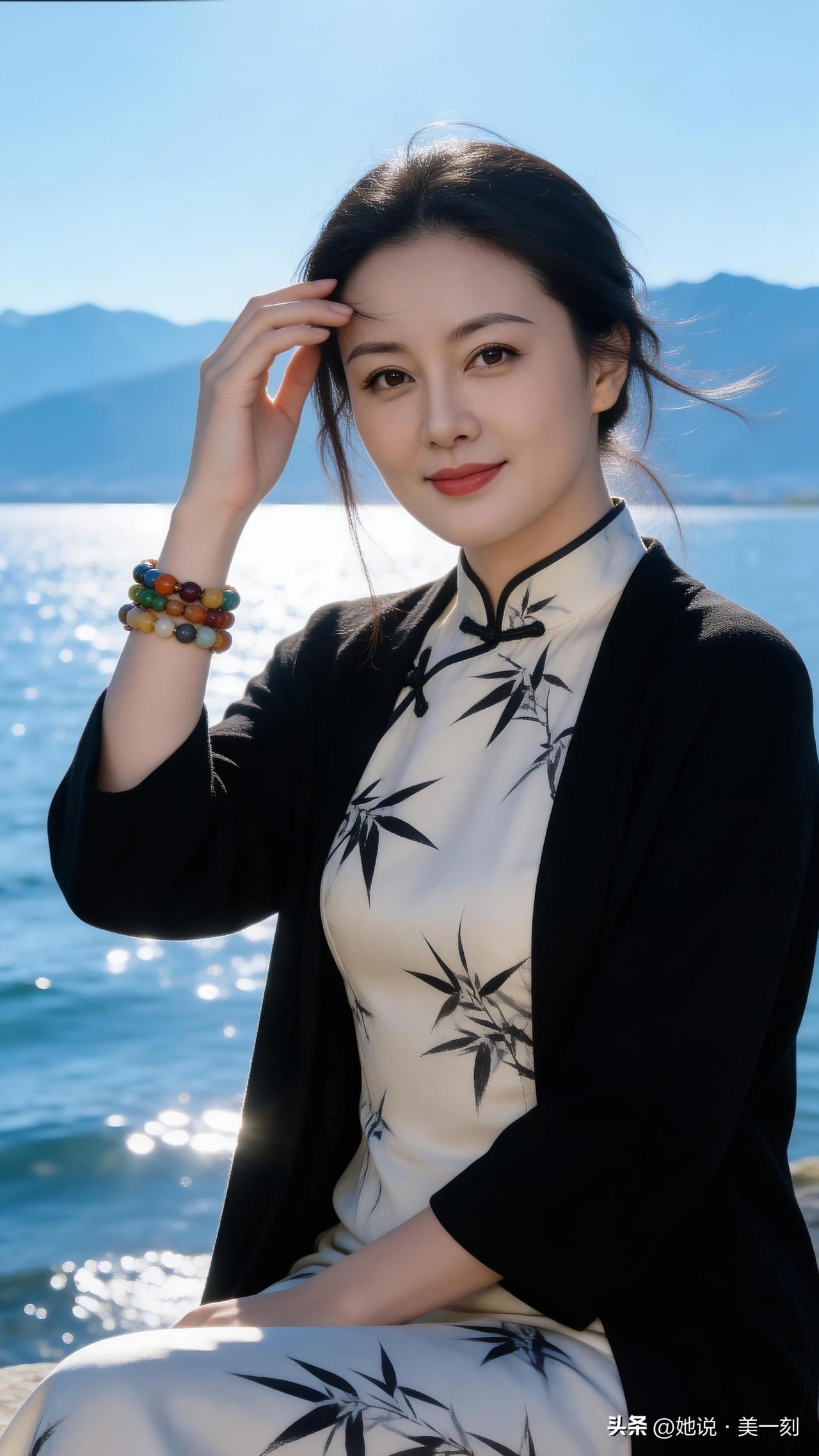 在湖边,感受宁静与美丽,黑白色调与自然风光的完美融合。50岁女性怎么穿知性优雅?
