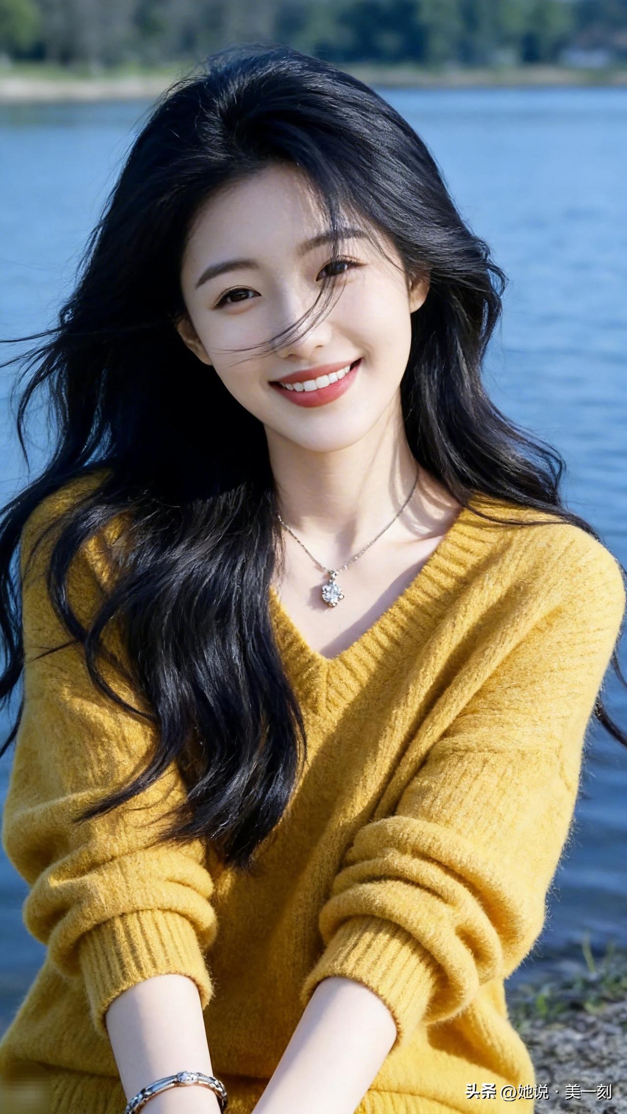 阳光明媚的湖边,甜美笑容的少女,温暖黄色毛衣,清新自然,元气满满!🌞💛😊有哪些美女让人过目难忘?