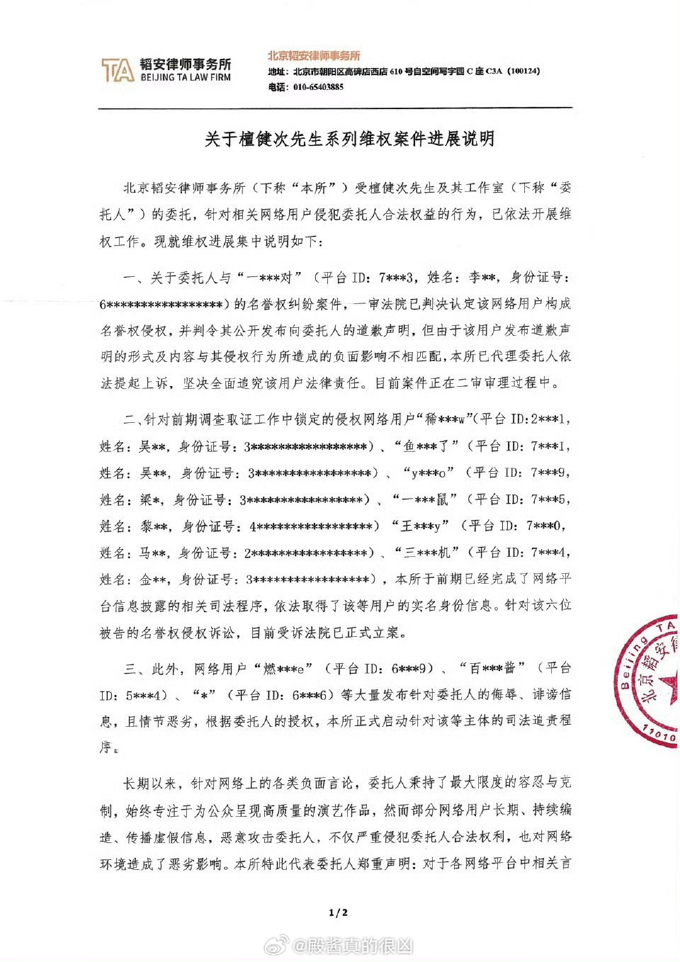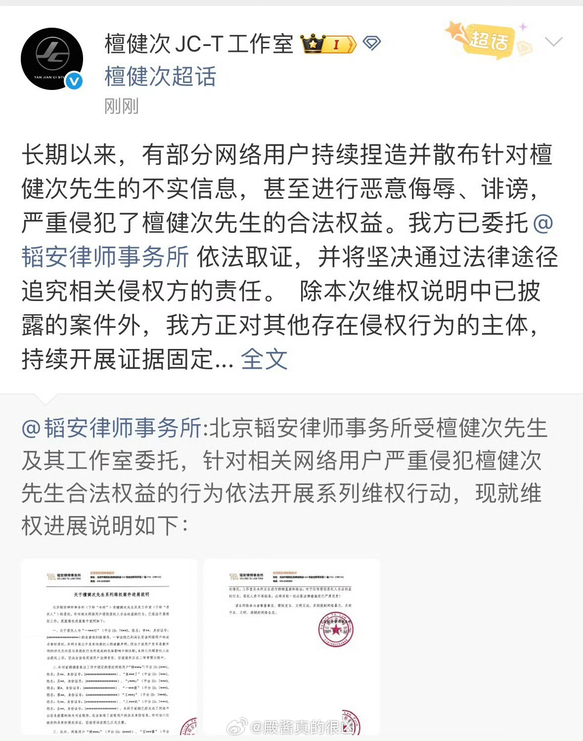 檀健次工作室发布告黑名单互联网非法外之地,支持檀儿维权。