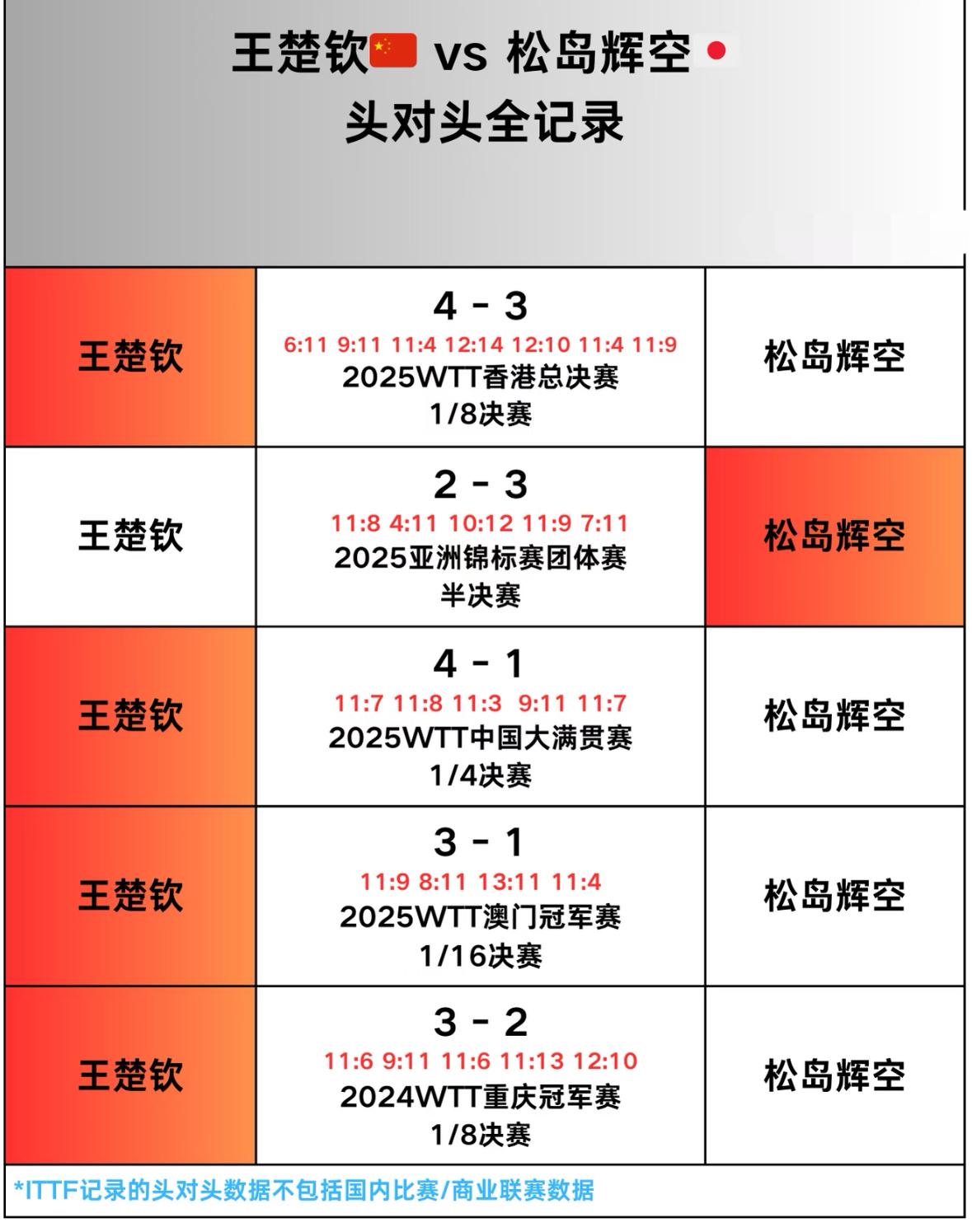 王楚钦与松岛辉空的头对头全记录——重庆冠军赛1/4对阵 王楚钦VS松岛辉空, 重庆冠军赛, 王楚钦3:0弗朗西斯卡,晋级8强, 松岛辉空3:0林文政,晋级8强! 1/4对阵,王楚钦再战松岛, 从两个人的交手记录来看, 王楚钦对松岛辉空保持4胜1负的 优势战绩,他们的最后一次交手 是在2025年总决赛中, 当时王楚钦4:3松岛辉空, 比分差距不大,非常胶着, 时隔不足三个月, 王楚钦再战松岛, 一定要做足准备, 松岛涨球很多, 但王楚钦最近的状态更稳, 加油王楚钦!
