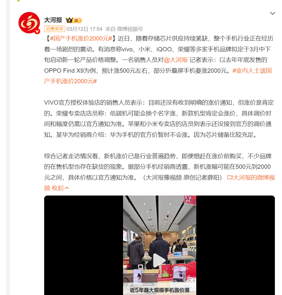 国产手机涨价2000元 存储芯片持续紧缺,手机圈迎来大震荡!网传vivo、小米、iQOO、荣耀等品牌,计划 3 月中下旬集体调价。销售人员透露:OPPO Find X9 预计涨约500元,部分折叠屏机型涨幅2000元。您最近有买手机的计划吗?先买还是等以后价格落了买?