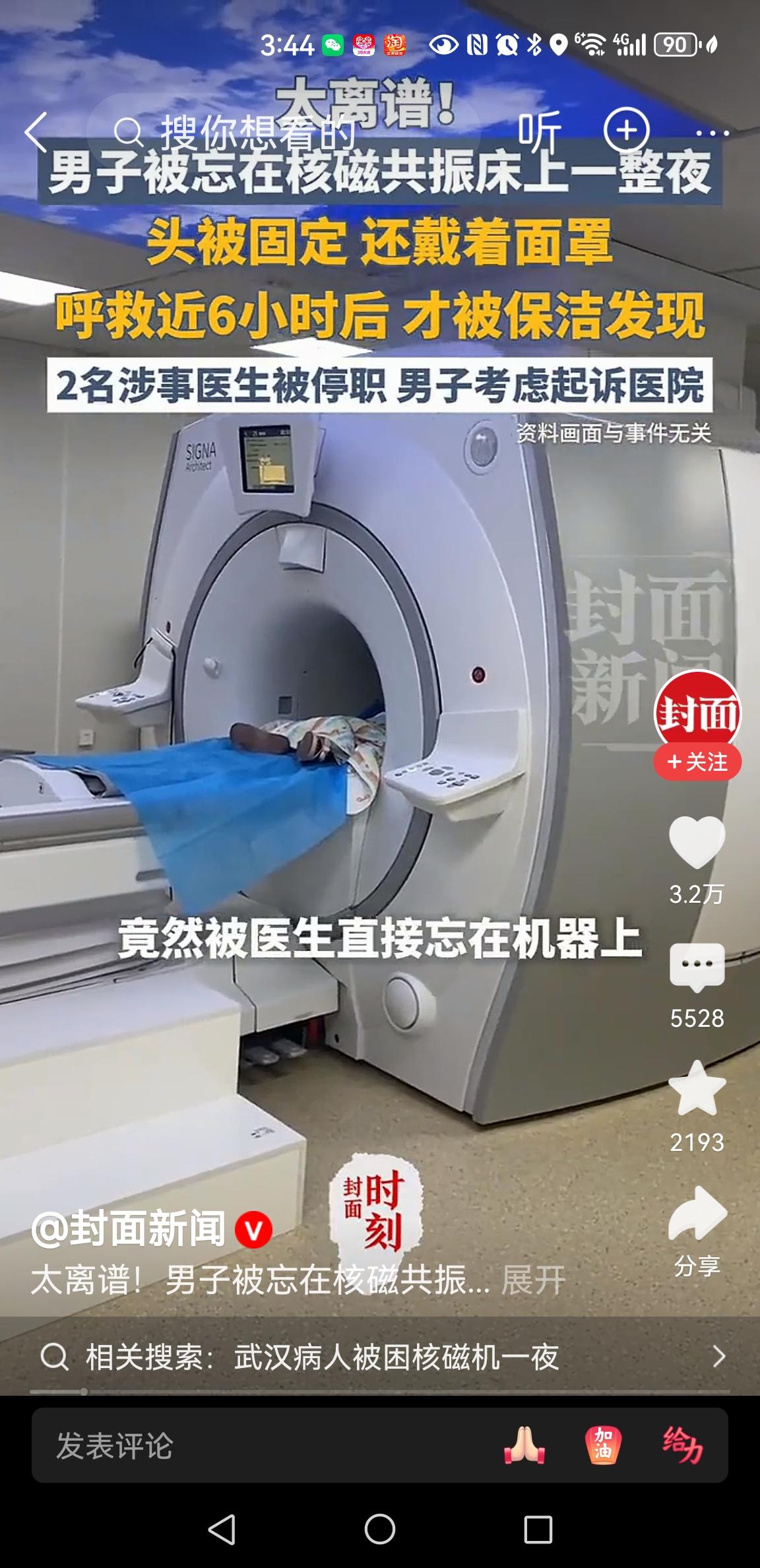 医生停职 男子在核磁共振室待了6小时,他有多绝望啊! 武汉一名男子,因疼痛就医坐核磁共振时,医生突然离岗。 这一去,就是足足六小时。男子孤独地躺在检测床上,头部被固定,戴着面罩,手机在外边…不知道有多绝望。 幸好,保洁员入室打扫卫生,才发现了他。 6小时待在核磁共振室,不知道有没有辐射? 即便没有,病人这6小时内心的孤独与绝望,给心理造成多大的阴影! 目前,涉事医生已经被停止检查!医生擅离职守,病人以命相托,可医生拿病人的生命当儿戏。 但是,想不明白的是,一个医生失职,医院整个系统失灵,医院有关领导就没有责任吗?至少, 应该有管理不严之责吧!