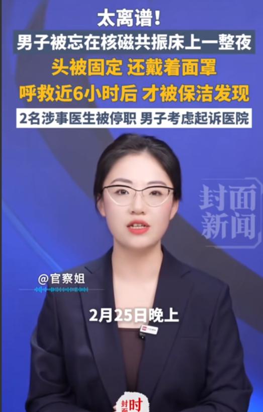“离谱他妈给离谱开门,离谱到家了!” 做核磁共振检查,人竟然被忘在机器上,关了整整六个小时。这事发生在湖北武汉,听着就让人后背发凉。 唐先生因为脖子疼,去医院做核磁共振。他从晚上十点排队,等到凌晨才轮上。躺上机器,医生固定好他的头,罩上面罩,他就在那儿等着。 结果,这一等就出事了。医生操作完,因为有急事,在系统里随手点了“检查完成”,跟同事说了句“机器上还有病人”,就匆匆走了。同事转头就把这事忘了。 唐先生就这样被遗忘了。他躺在轰鸣的机器里,脖子被固定着,眼前一片黑。他大声喊人,喊破了喉咙,也没人答应。他想动又不敢动,怕有危险。在黑暗和噪音里,他独自煎熬了六个小时,每一分钟都是恐惧。 直到早上六点多,保洁员来打扫卫生,才听到呼救声,把他救了出来。而他的妻子,因为联系不上他,急得报了警,找了一晚上。 事情发生后,医院把两个涉事的医生停职了,也道了歉。但说到赔偿,双方没谈拢。医院说,核磁没辐射,对身体没影响,建议唐先生去法院起诉。 网友一听这话,全炸了。有网友说,医院说没伤害?那让那两个医生和院长,也每人上去躺六个小时试试!还有网友说,人被固定着,眼前一片黑,机器一直响,别说六小时,一小时精神都得崩溃。这不是赔钱的事,这是严重的失职。 更离谱的是,医生在系统里随手点了“完成”。这意味着,唐先生排队两小时等来的检查,结果可能根本就没用。人差点出事,检查也可能白做了。 说到底,这不是小事。这是把人命和安全当儿戏。医生一个随手操作,同事一个转头就忘,对患者来说就是一场灾难。希望这事能给所有医护人员提个醒,手上的工作,关系着别人的安危,一点都马虎不得。