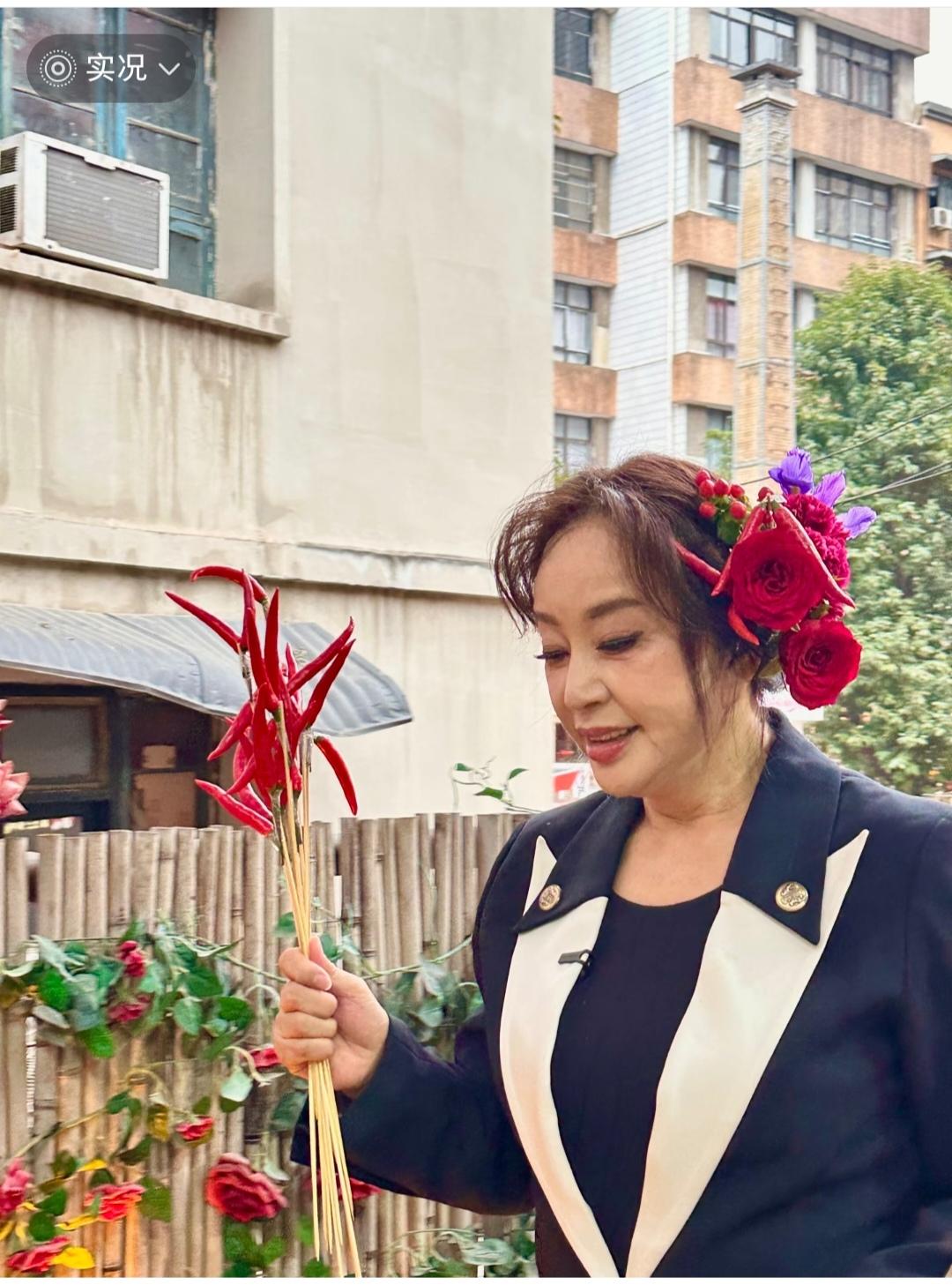 刘晓庆,积极向上的人,头上这一坨花好喜庆。