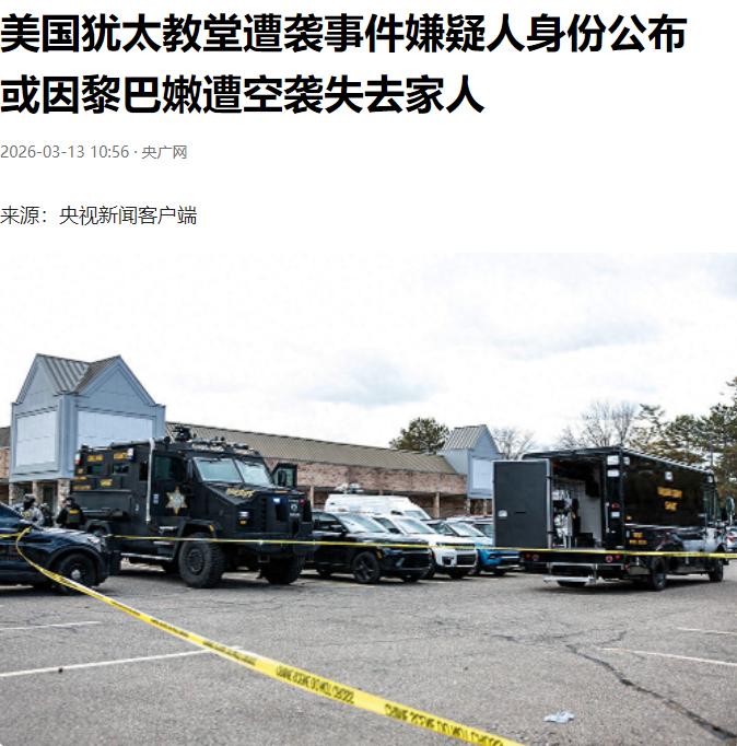 战火最终还是烧到美国本土了 美国当地时间3月12号,新华社纽约分社发布权威消息,美国密歇根州底特律市西北郊区的西布鲁姆菲尔德犹太教堂,发生了一起蓄意持枪驾车袭击事件。 这不是普通的街头冲突,也不是偶发的治安案件,而是一场有准备、有目标、带着强烈报复意图的暴力攻击,让远在北美的美国本土,第一次如此直接地感受到中东战火蔓延过来的灼热与危险。 事发时,这座当地规模较大的犹太教堂内,附属幼儿日托中心还有140名学龄前儿童正常上课,工作人员与信众也在开展日常活动,谁也没料到平静的午后会被暴力打破。 嫌疑人驾驶车辆径直冲撞教堂入口,同时持步枪与安保人员交火,冲突中车辆起火,现场冒出滚滚黑烟,场面一度十分混乱。 最终嫌疑人在交火中身亡,一名安保人员受伤,另有数十名现场处置的执法人员因吸入浓烟送医观察,万幸的是,教堂内的儿童与教职人员无一伤亡,避免了更惨痛的后果。 美国有线电视新闻网援引执法部门消息证实,嫌疑人车辆后备箱内搜出大量爆炸物,一旦引爆,后果不堪设想。 随着美国国土安全部、联邦调查局陆续披露信息,嫌疑人身份与背后的隐情逐渐清晰。41岁的艾曼·穆罕默德·加扎利是黎巴嫩裔美国公民,2011年以配偶签证入境美国,2016年正式入籍。 而他发动袭击的直接诱因,是大约10天前,其家族所在的黎巴嫩村庄遭遇空袭,两名兄弟、两名侄子不幸身亡,多名亲属重伤,亲人离世的打击让他陷入极端情绪,最终将怒火发泄在美国本土的宗教场所,把远隔重洋的战乱仇恨,直接搬到了美国的街头。 这起事件最值得深思的,是它彻底打破了美国长久以来的“安全幻觉”。一直以来,美国频繁介入中东事务,地缘博弈、军事行动不断,战火在中东土地上燃烧多年,美国本土却始终置身事外,仿佛隔着大西洋与太平洋,就能隔绝所有冲突与仇恨。 但这次袭击用最直白的方式证明,全球化时代没有绝对的安全孤岛,海外的战乱、族群的仇恨、无辜者的伤痛,不会永远停留在千里之外,当矛盾不断累积、情绪不断激化,终究会以最极端的方式,反噬到介入者的本土之上。 从事件性质来看,联邦调查局已将其定性为针对犹太社区的定向暴力行为,这也折射出美国社会当下的深层撕裂。 近年来,美国国内仇恨犯罪持续攀升,宗教对立、族群矛盾不断加剧,而海外局势的动荡,无疑成为激化本土矛盾的催化剂。 中东的战火本与美国普通民众无关,却因为美国的对外政策,让无辜者被迫承受暴力威胁,教堂本该是宁静的信仰之地,如今却沦为冲突的“延伸战场”,这不仅是美国社会治安的失败,更是其对外策略带来的必然代价。 事发后,美国警方迅速封锁周边区域、发布避险令,加强各类宗教场所的安保巡逻,密歇根州政府也发声谴责暴力,但这些举措只能治标,无法从根源上化解问题。 海外战火不熄,本土仇恨难平,当美国持续在全球各地制造或卷入冲突,就注定要面对冲突回流的风险。 这起犹太教堂袭击案,只是一个警示,告诉美国也告诉世界,肆意搅动地区局势,终将让战火越过重洋,烧到自己的家门口。 和平从来不是单方面的,远离战火的前提,是不主动点燃战火。美国本土遭遇的这起袭击,不是偶然,而是长期地缘博弈埋下的隐患爆发。 当海外的伤痛变成本土的危机,当宗教场所变成暴力现场,美国或许该重新思考,究竟该如何真正守护本国民众的安全,而不是一味在海外制造动荡,最终让动荡反噬自身。