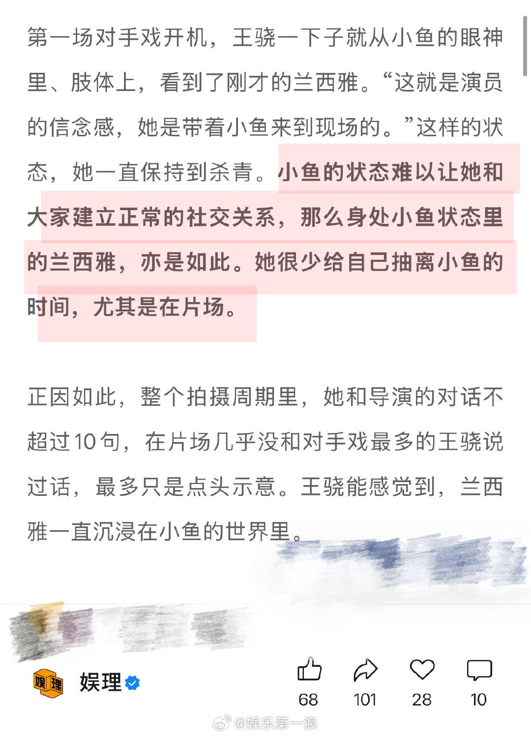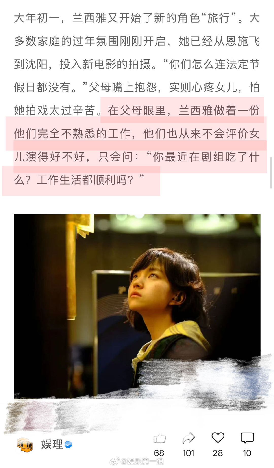 兰西雅担心幼态脸影响角色呈现 兰西雅谈过于夸张的赞赏何尝不是误解 也会纠结:“为什么我这部戏演得就没那么放松,为什么我会这么紧张?”后来她开始接受并允许自己有紧张感,“我不可能永远把自己调整到平衡的状态,所有感受都是正常的。”因此,她对文字的想象也有了新的理解:“剧本从来不是严丝合缝的,而是留有空间的。”娱理独家↓