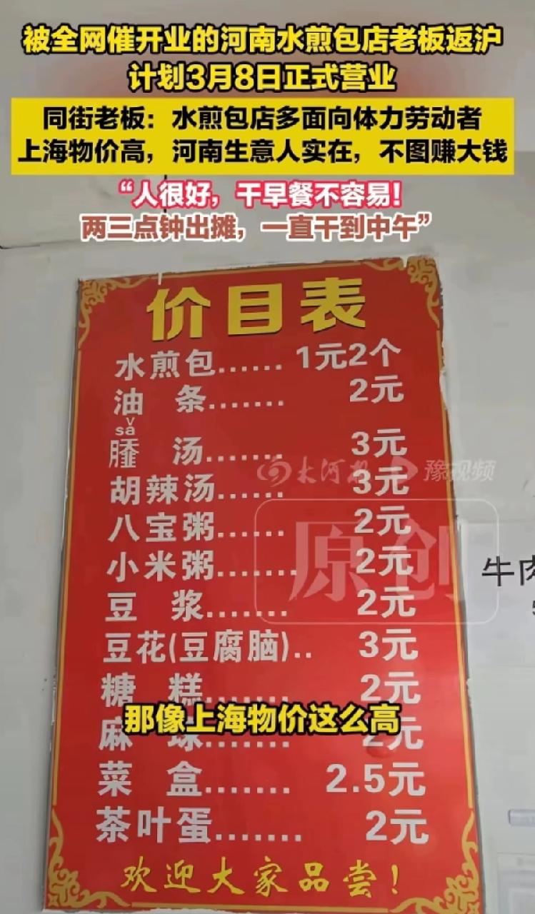 上海河南水煎包为什么爆火?看似偶然,其实老板夫妻俩,为人处世的回报!一是与人为善,现在太火了,门口排队顾客站不下了,摊位都摆不下了,隔壁店铺女老板不但不眼红,还主动把自家门口地方拿出来用!这是平时相处的太好了!二是做生意物美价廉,看看价目表,水煎包1元2个,豆浆2元,胡辣汤3元,最高3元,在上海,比五线县城还低!可见,好人有好报,不是一句空话,不是好运气不到,而是还没到时候!
