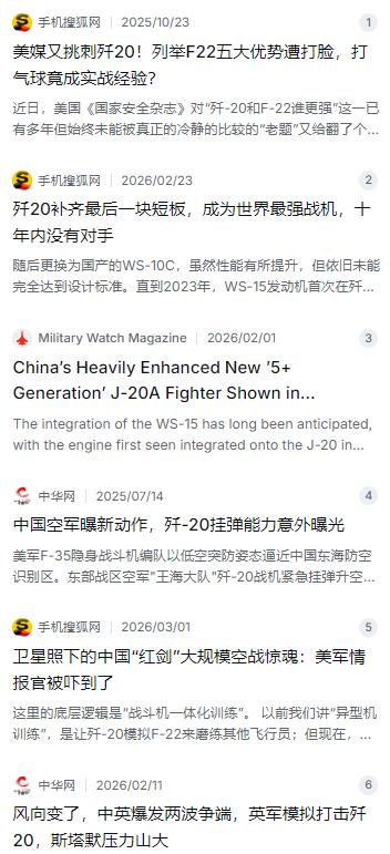 任何一个国家的四代机都可以击落中国的五代机歼 20,而美国不但找到了歼 20 的弱点,还给出了非常有道理的依据,难道我们的武器就这么差劲么?美国人的说法是真的么? 麻烦看官老爷们右上角点击一下“关注”,既方便您进行讨论和分享,又能给您带来不一样的参与感,感谢您的支持! 最近这几年,只要咱们的歼-20一有动静,西方媒体尤其是美国那边,总少不了冷嘲热讽。从最早的“隐身设计有缺陷”,到“发动机是心脏病”,再到“就是个没实战经验的绣花枕头”,各种帽子是轮着扣。更有甚者,有些美国媒体和所谓的专家言之凿凿,说随便一个美国的四代机,比如F-15或者F-16,只要战术得当都能击落歼-20。这话听着是不是特别提气?但也特别让人犯嘀咕:难道咱们费尽心血搞出来的大国重器,真就这么不堪一击?美国人说的那些所谓的“弱点”,到底是真的抓住了命门,还是另有所图? 咱们先把美国人常挂在嘴边的几条“罪状”掰扯清楚。头一条就是揪着歼-20的发动机不放,说早期版本用的是俄罗斯的AL-31F,推力不足,特别是跟F-22的F119比起来,超音速巡航能力就是个大短板。这话搁在十年前,那确实是事实,咱们不回避。2011年歼-20刚首飞那会儿,动力系统确实是在“摸着石头过河”,先用成熟的俄发把飞机送上天,这是符合科研规律的稳妥路子。但问题是,美国人这些年似乎活在了过去,他们的情报系统和媒体,好像选择性失明了,愣是看不见中国航空工业这几年的狂奔 。 事实是什么呢?歼-20早就不是当年的吴下阿蒙了。中间批次的歼-20已经换装了国产的WS-10C“太行”改进型发动机,推力大幅提升,可靠性也经过了这几年的高强度训练验证,彻底解决了有无问题。但这还不是终点,真正让歼-20完成蜕变的,是专为其量身定制的WS-15发动机。根据公开的信息和航空工业的官方披露,WS-15是一款推重比达到10一级的大推力涡扇发动机,最大推力甚至超过了18吨,这个数据已经超过了F-22所用的F119发动机 。就在2025年底,装上WS-15的歼-20A已经批量亮相,并且完成了多项高难度测试 。这意味着什么?意味着歼-20当初设计时预留的气动潜力,终于被完全释放出来了,不仅拥有了真正的超音速巡航能力,机动性更是上了一层楼。美国媒体再拿发动机说事儿,那就是揣着明白装糊涂了。 第二条,是说歼-20的隐身设计有缺陷,特别是那个鸭翼,被不少西方专家看作是破坏隐身的“原罪”。他们的理论是,鸭翼在机动时会偏转,会形成强反射源,破坏战机的整体隐身效果。这话听起来好像挺专业,但实际上是把复杂问题简单化了。隐身设计是一个极其复杂的系统工程,不是简单的“有鸭翼就不隐身”。歼-20采用的是独一无二的“升力体边条鸭翼布局”,鸭翼和主机翼、边条是一个有机的整体,通过精细的设计和吸波涂层的应用,把鸭翼带来的雷达反射降到了极低的水平。再说了,现代空战,尤其是隐身机之间的对抗,强调的是超视距打击、体系作战和电磁压制,不是非要像玩“大家来找茬”一样纠结于某个部件的那零点零几平方米的雷达反射截面积差异 。F-22也有它的隐身死角,比如它的发动机喷口和嘉莱特进气道,在某些角度下同样是巨大的反射源。拿着放大镜找别人的毛病,却对自己的短板视而不见,这不是双标是什么? 至于第三条“没实战经验”,那就更有点“何不食肉糜”的味道了。美国人仗着这二十年打了不少不对称战争,炸炸帐篷、打打气球,就觉得自己积累了宝贵的“实战经验”,甚至拿这个来嘲讽歼-20 。但明眼人都看得出来,那种建立在绝对制空权和非对称优势下的对地攻击,跟大国之间争夺制空权的血腥厮杀,完全是两码事。F-22服役这么多年,干的最多的活儿也就是去叙利亚上空转悠两圈,震慑一下连像样防空系统都没有的对手,什么时候跟同级别的隐身机真刀真枪干过?反倒是咱们的歼-20,虽然没有经历过战争,但在咱们自家门口,经历的“实战化对抗”一点不比任何人少。 央视就曾经公开报道过,东部战区空军的“王海大队”驾驶歼-20在东海防空识别区,多次遭遇并逼退了外军的隐身战斗机 。那是什么场面?那是真正的隐身机对隐身机,在复杂的电磁环境下,在贴近实战的对抗中,靠着飞行员的过硬技术和飞机的卓越性能,把对方的F-35给生生挤出去了 。这种高强度的贴身较量,远比隔着几千公里扔炸弹来得更考验人和武器的极限。而且,咱们国内每年举行的“红剑”等大规模体系对抗演习,其复杂性和烈度,就连美军的情报官看了卫星照片后都直呼“被吓到” 。在那种动辄上百架战机、跨越数千公里、融合了预警机、电子战飞机和地面雷达的立体攻防中历练出来的战术素养,含金量绝对不低。