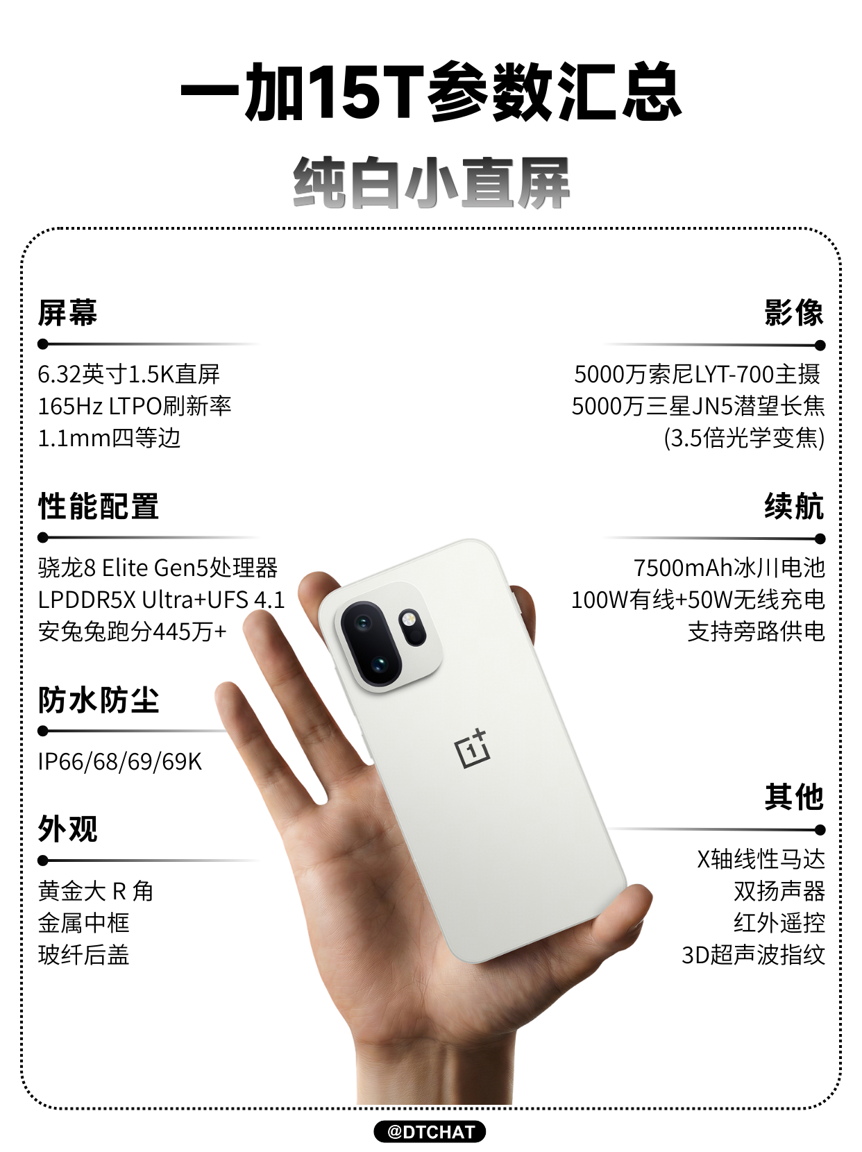 一加15T参数汇总,配置补齐了上代的短板,真全能小屏旗舰!