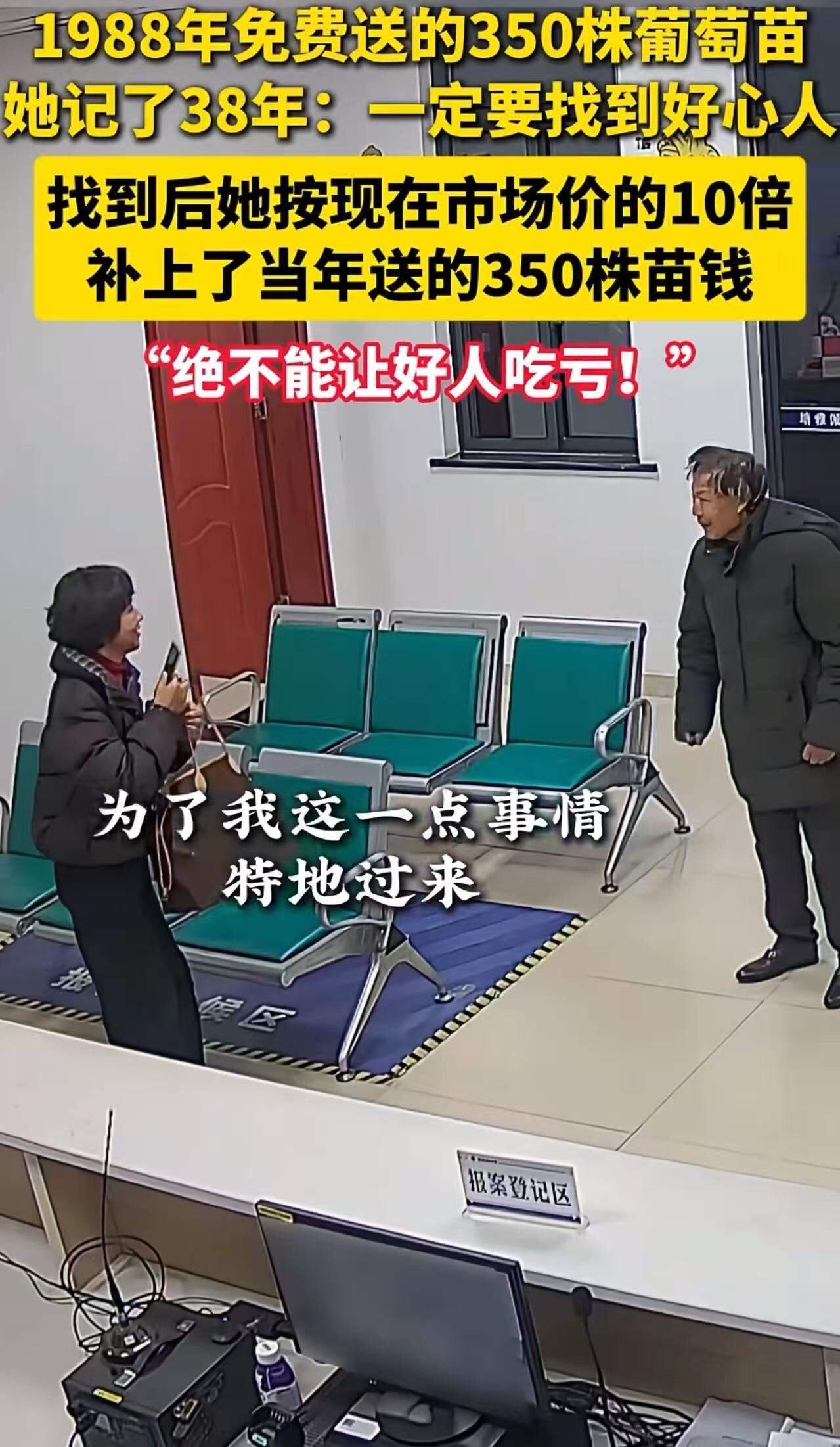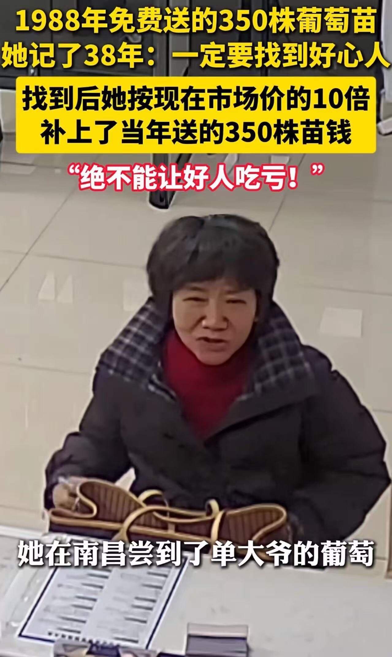 “绝不能让好人吃亏”!1988年,女子家里穷得揭不开锅,有人免费送她350株葡萄苗,让女子发家致富。这份恩情女子记了38年:“一定要找到好心人!”在民警帮助下,女子找到了那位恩人,按现在市场价的10倍补上了当年送的350株苗钱! 这样的故事,听起来是不是有点像电影里的桥段?但它真实发生在我们身边,让人心头一暖,也让人深思:在这个物欲横流、快节奏的社会,还有多少人会像这位女子一样,铭记善意,誓言不让好人吃亏? 38年前,她家穷得捉襟见肘,生活几乎看不到希望。正是在那个关键时刻,一位好心人毫无保留地送来了350株葡萄苗。那不仅仅是苗木,而是一条通往新生活的希望之路。凭着这份厚重的恩情,女子和家人辛勤耕耘,终于走出了贫困,走向了富裕。 然而,更多人会选择忘记过去的恩情,甚至理所当然地接受帮助不还情。但她没有。38年过去,她依然记挂着那份恩情,心中有一个坚定的信念:一定要找到那个好心人,告诉他——你的善良没有被辜负,我要把当年的苗钱补上,绝不能让你吃亏! 这份执着和责任感,令人动容。在民警的帮助下,她终于找到了恩人。当得知女子要按现在市场价的10倍补偿当年送的苗时,恩人却笑着说:“当年帮人是义务,没想到你还记得这份情,我已经很满足了。” 这段对话,看似简单,却深刻揭示了人性最美好的一面:善良与感恩的力量。这不仅是一笔钱的往来,更是一场对诚信和道义的坚守。它告诉我们,真正的财富,不是银行账户上的数字,而是人与人之间的信任与温暖。 看到这里,你是否也开始反思:我们在生活中,有没有对那些帮助过我们的人足够感恩?有没有勇气和责任去回报他们?这份故事给我们的最大启示,或许正是——“善良和感恩,永远不能缺席。” 欢迎大家在评论区分享你的“好人好事”,让我们一起传递这份温暖和正能量,温暖更多的心灵。毕竟,社会因善良而美好,因感恩而充满希望。