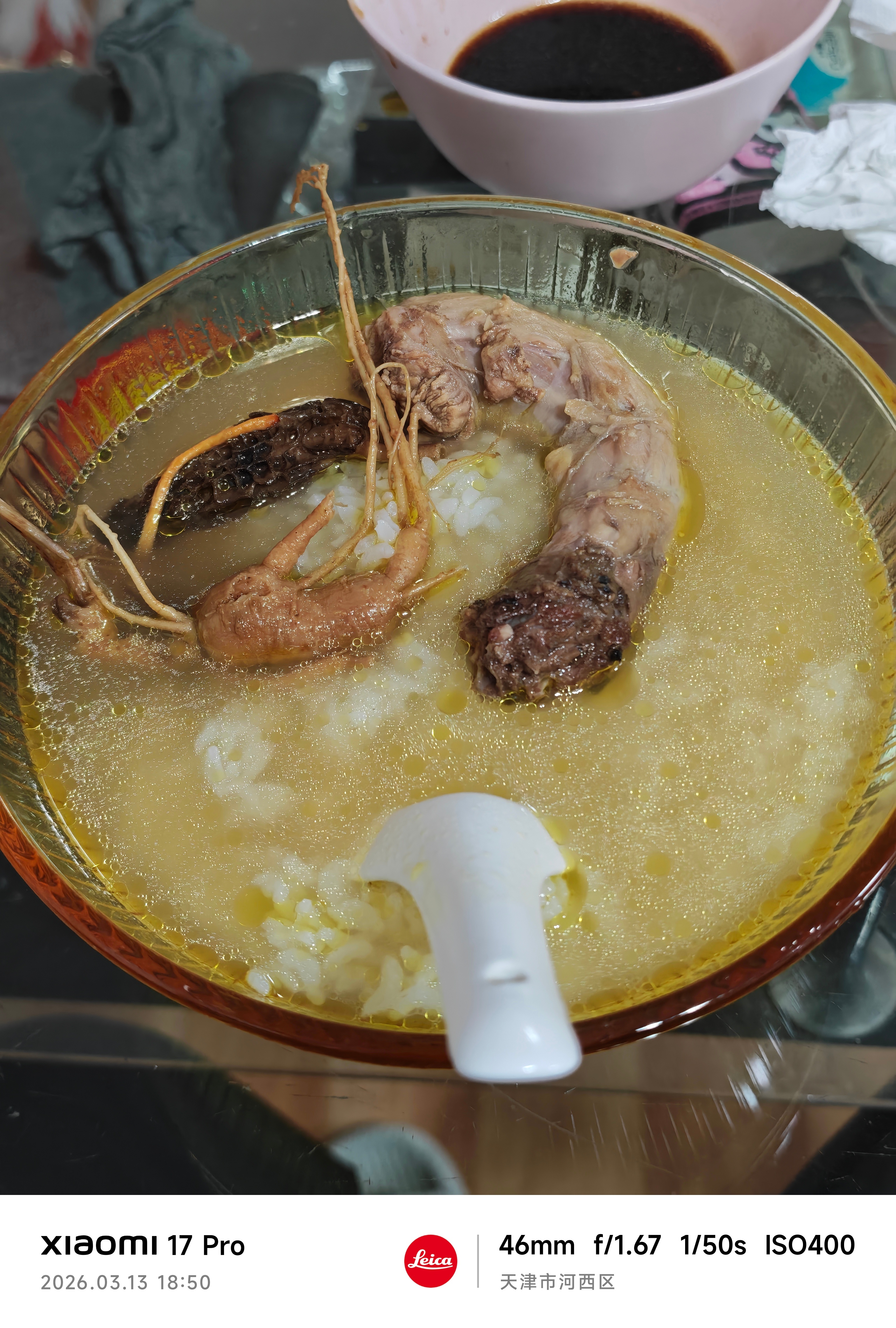 之前东北刘亦菲给我寄了东北特产,人参!为了配这个高端货,特地买了散养了9个月的鸡,一起熬汤,大补特补!人参鸡汤泡饭,非常美味,还是用的东北五常大米,这顿饭营养价值太高了。东北特产好啊!