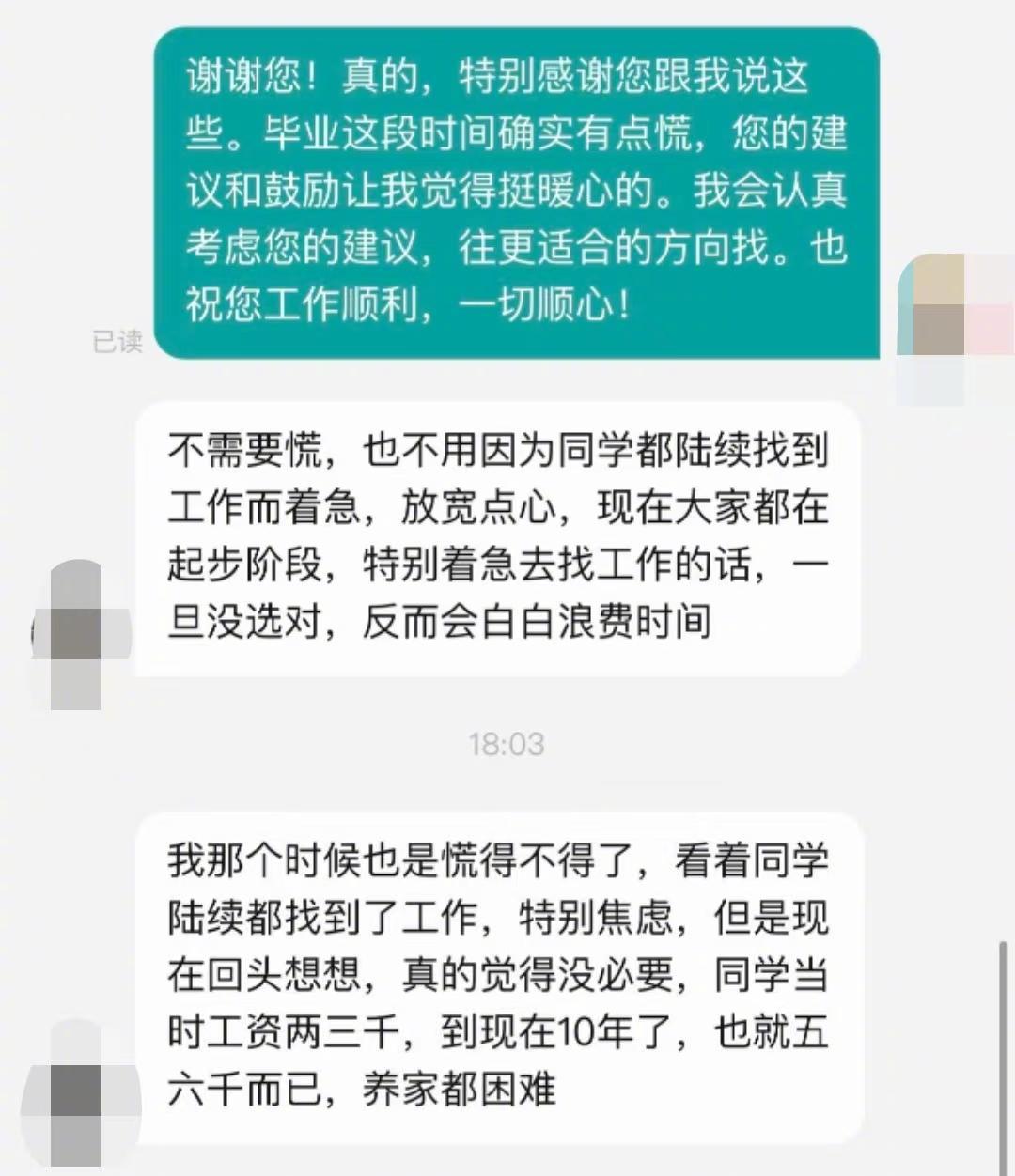 ”这件事发生在3月8日。”张女士告诉南都记者,她是2025届室内设计专业的毕业生,以设计类工作和其他专业相关的岗位作为求职方向。上述暖心HR来自广东佛山南海区一家金属制品企业。事发前两天,她因家里催得紧,投了约50家公司的岗位。“软件上大部分的HR都是已读不回,或者是连看都不看。我的精神高度紧绷、极度焦虑。看到他的暖心话语后,真的一下子没绷住哭了出来。”