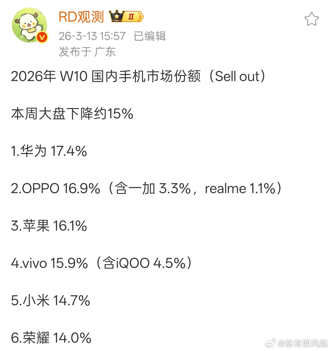 W10 国内手机市场份额排行发生了变动,华子登顶,OPPO第二,苹果第三。
