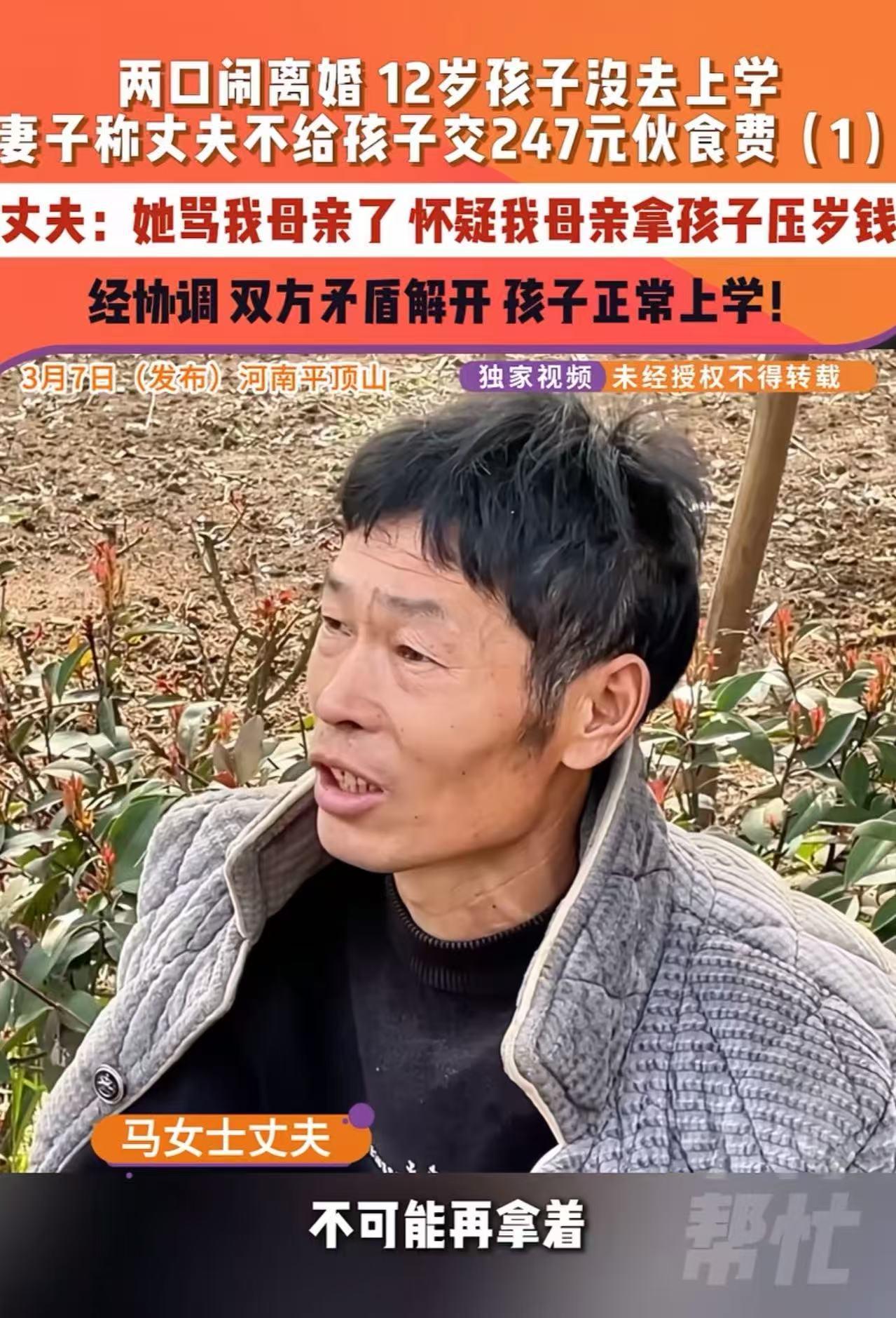 河南平顶山,女子怀疑婆婆拿走了孩子的压岁钱,对着婆婆就是一顿痛骂。丈夫知道后,为了给她一点教训,直接断了她的经济命脉,拒绝给孩子交247元的伙食费!女子一气之下喊来调解员评评理,但结果出人意料! 李女士看着班级群里的伙食费接龙,很是烦躁,全班同学都接龙了,就剩她家儿子没交。 可是她翻遍了口袋,连个钢镚都没凑出来。她全职在家带孩子,钱全攥在丈夫王先生手里。 可这次,王先生铁了心要“治”她。 原来,前几天,李女士发现儿子红包里的块钱不翼而飞。 她脑子里那根弦瞬间崩了,第一反应就是:“肯定是婆婆拿的!” 平日里婆媳间的那些小摩擦,此刻全变成了“罪证”。 她冲进婆婆房间,劈头盖脸就是一顿痛骂,言语之难听,连旁人都听不下去。 婆婆气得直抹泪,儿子王先生得知后,怒火中烧。在他看来,钱没了可以再挣,但母亲的人格被侮辱,这口气咽不下。a 于是,他做出了一个极端的决定:切断妻子的所有经济来源,连孩子的伙食费也扣下。他要让妻子尝尝“没钱寸步难行”的滋味,逼她低头认错。 李女士哭着找来了调解员。她委屈又愤怒:“夫妻吵架归吵架,怎么能拿孩子的前途撒气?” 可是王先生却说“你自己想办法!你骂我妈的时候,怎么没想过今天?这247块我就是不交,让你长长记性,知道这个家谁说了算!” 调解员劝说:’孩子没饭吃上不了学,毁的是他一辈子啊!” 王先生说:“她太过分了!指着我的鼻子骂我妈,说老人手脚不干净,偷孙子的钱!我妈辛苦帮忙带娃,受得了这委屈?我今天就得让她知道,在这个家,尊重长辈是底线!” 夫妻俩僵持不下,夹在中间的孩子成了最无辜的牺牲品。 于是调解员决定跟孩子聊聊:“孩子,你说实话,压岁钱到底去哪了?” 孩子涨红了脸,双手紧紧抓着衣角,声音小得像蚊子哼:“是我……是我自己偷偷花光了。我买了游戏皮肤,还买了好多零食,不敢告诉爸妈,怕挨打。奶奶没拿,真的没拿……” 这句话,像一记响亮的耳光,狠狠抽在了在场每一个人的脸上。 空气瞬间凝固了。 李女士愣在原地,眼泪刷地流了下来。她想起自己刚才对婆婆恶语相向的样子,想起婆婆平时默默做饭洗衣的身影,愧疚得像要把心挖出来。 “妈……对不起!”李女士主动道歉。 王先生看着一脸惊恐的儿子,和道歉的妻子,心里的火瞬间灭了,取而代之的是深深的自责。 “是我太冲动了……”王先生红着眼眶,当场掏出手机,秒转了孩子的伙食费,又额外转了一笔钱给妻子,“老婆,只要咱们好好过日子,钱我来挣,家我来扛。以后遇事咱们商量,再也不这么干了。” 误会解开,阳光重新照进这个家。儿子背起书包,脚步轻快地跑向了学校。 【犀利观点】 别让“想当然”的猜忌,成为刺向家人的利刃;更别用“惩罚孩子”的方式,去报复你的伴侣。 李女士的错误,不在于丢了钱,而在于未经核实就先定罪。 在潜意识里,她或许早就对婆婆有了偏见,所以一旦出事,婆婆就是那个“完美的替罪羊”。 这种“有罪推定”的思维,是家庭关系的剧毒。 一句伤人的话,就像钉进木头的钉子,即便拔出来,洞也永远在那儿。 如果不是孩子最终说了实话,这个家恐怕真的要因为两千块钱,彻底分崩离析。 在没有证据之前,哪怕是最亲密的人,也要给予最基本的信任和尊重。 而王先生为了教训妻子,竟然狠心让孩子交不起伙食费,甚至面临辍学。 这哪里是教育?这是泄愤! 夫妻矛盾是成年人之间的事,为什么要让孩子来买单? 在孩子眼里,爸爸因为妈妈骂了奶奶就不让自己吃饭上学,这会让他产生多大的恐惧和不安全感? 这种“杀敌一千自损八百”的做法,不仅解决不了问题,反而会在孩子幼小的心灵里埋下仇恨和冷漠的种子。 真正的赢家,不是看谁把谁制服了,而是看谁能为了孩子,先低下高贵的头颅。 这件事里,没有绝对的坏人。 妻子是一时心急口不择言,丈夫是想维护母亲尊严,婆婆是默默承受委屈。 大家都爱这个家,却都用错了方式。 如果李女士能多问一句“钱去哪了”,如果王先生能先冷静听听解释,如果婆媳之间能多一份坦诚……悲剧就不会发生。 家,不是讲理的地方,是讲爱的地方。 当你举起拳头想要反击时,请先想想身后那个无辜的孩子。 多一点信任,少一点猜忌;多一份包容,少一份冲动。毕竟,赢了道理输了家,才是这世上最赔本的买卖。