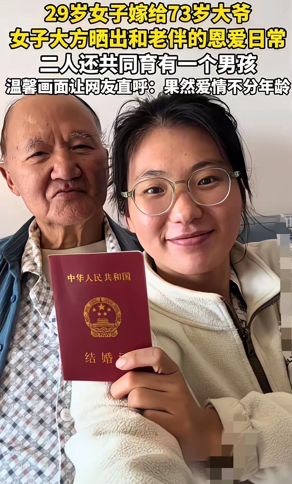 真的太让人意外了!29岁女子嫁给73岁大爷 ,还幸福晒出结婚证,两人甚至有了一个可爱的儿子。 很多人不理解,年轻姑娘放着同龄小伙不选,偏偏选择能当爷爷的伴侣,不少人猜测是恋父情结,也有人觉得难以接受。 但从她满脸笑容能看出来,她对这段婚姻是真心满意,过得踏实又安心。 爱情本就没有统一标准,年龄从不是衡量真心的唯一尺子。只要双方真诚相待、彼此扶持,不伤害他人,外人也不必过多评判。 这样的爷孙恋,你能接受和理解吗?