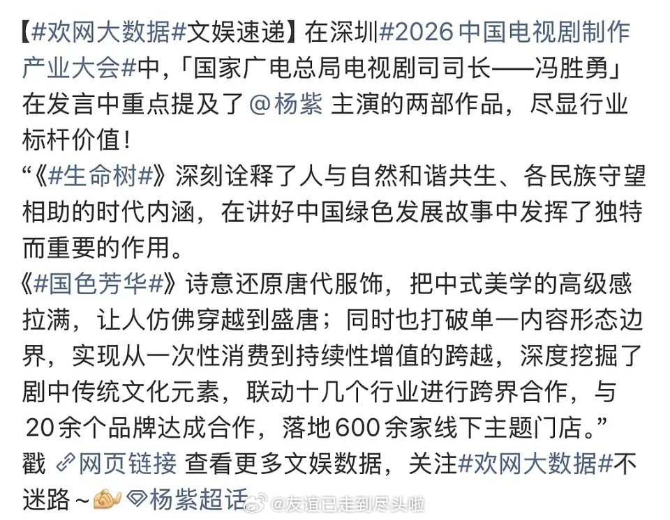 今天中国电视剧制作产业大会广电总局夸了又杨紫的《国色芳华》和《生命树》,深耕长剧品质的守望者 杨紫又被表扬了