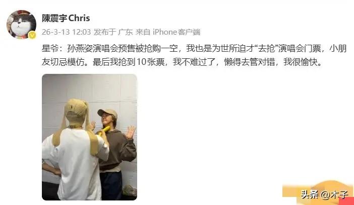 62岁周星驰这波操作,直接把全网网友笑疯了!拍了一辈子无厘头打劫名场面,这次居然为了孙燕姿的演唱会门票,把“打劫”玩到了现实里! 3月13日,周星驰经纪人晒出的合照直接刷屏全网:星爷头套丝袜、拿香蕉当枪抵着孙燕姿脖子,1:1复刻了《家有喜事》里的经典打劫桥段,孙燕姿举着双手配合投降,画面又好笑又满是梦幻感。 配文更有梗,星爷半开玩笑说自己是抢不到票“为世所迫”,还得意宣布“打劫到10张票”。 而且,整段话里藏了《我不难过》《懒得去管》《我很愉快》三首孙燕姿的经典歌名,合着这哪是打劫,分明是藏了多年的老粉花式表白! 说出来你可能不信,堂堂喜剧之王,居然和我们普通人一样,栽在了孙燕姿的门票上。 这次孙燕姿时隔12年再开香港巡演,之前苏州站5.8万张门票,被120万人疯抢,开售即秒空,别说普通观众抢不到,连星爷都没抢到票,只能靠“打劫”找正主要。 其实,这场互动背后,藏了22年的意难平。2004年周星驰筹拍《功夫》时,就曾力邀孙燕姿出演片中的哑女一角,结果因为档期原因遗憾错过,银幕合作没成,22年后反倒用这种最符合星爷风格的无厘头方式,圆了同框的梦。 我们为什么会为这场互动疯狂? 因为一边是承包了我们无数个夜晚的无厘头电影,一边是填满了我们整个青春MP3的金曲,两大青春顶流的同框,哪里是简单的互动,分明是把我们一去不回的青春,又拉回了眼前。 你青春里印象最深的,是星爷的哪部电影,孙燕姿的哪首歌?评论区聊聊你的故事。