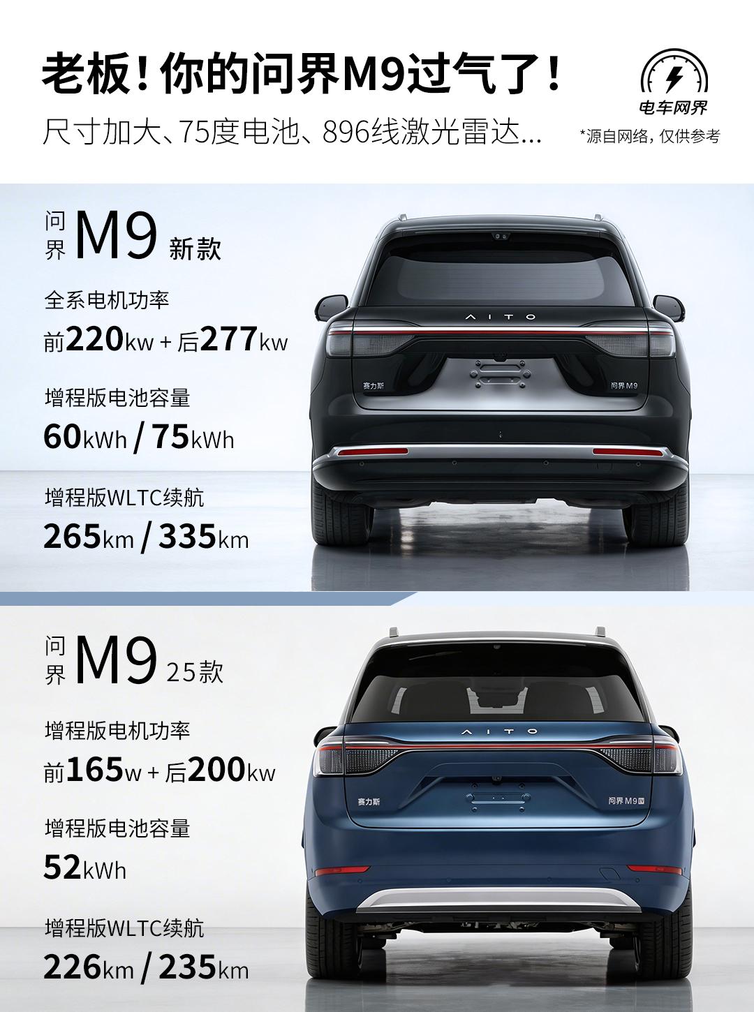 新款问界M9亮相工信部,这次的升级确实很有看点,从外观、尺寸到动力都进行了全面强化,看起来更猛了。 主要变化如下: 1. 外观设计:细节调整,气场更强 前脸造型重新设计,更有辨识度; 换装了与尊界同款的门把手,以及类似“大饼”风格的轮毂,豪华感提升; 车尾的尾灯细节增加了镀铬装饰,整体看上去更显精致和气派。 2. 车身尺寸:全面加长,空间更大 新款车型在长、宽、高以及轴距上都进行了提升,空间表现更值得期待: 车长:从5230mm增加到5285mm(增加了55mm)。 车宽:从1999mm增加到2026mm(突破了2米大关)。 车高:从1800mm增加到1845mm(增加了45mm)。 轴距:从3110mm增加到3125mm(增加了15mm)。 3. 动力性能:电机升级,续航可选 动力系统是这次升级的重点,无论是纯电版还是增程版,都换装了更强的电机组合(前220kW + 后277kW),相比老款(前160kW + 后230kW)提升非常明显。 增程版:搭载1.5T发动机(功率118kW),并提供60度和75度两种电池包可选,WLTC纯电续航里程在250-335km之间。 轮胎配置:最高可选22英寸轮毂,搭配295mm的超宽轮胎,进一步提升抓地力和行驶稳定性。 总的来说,新款问界M9这次算是一次从外到内的全方位升级,50万级的统治力又要加强了吗?【来自懂车帝车友圈】