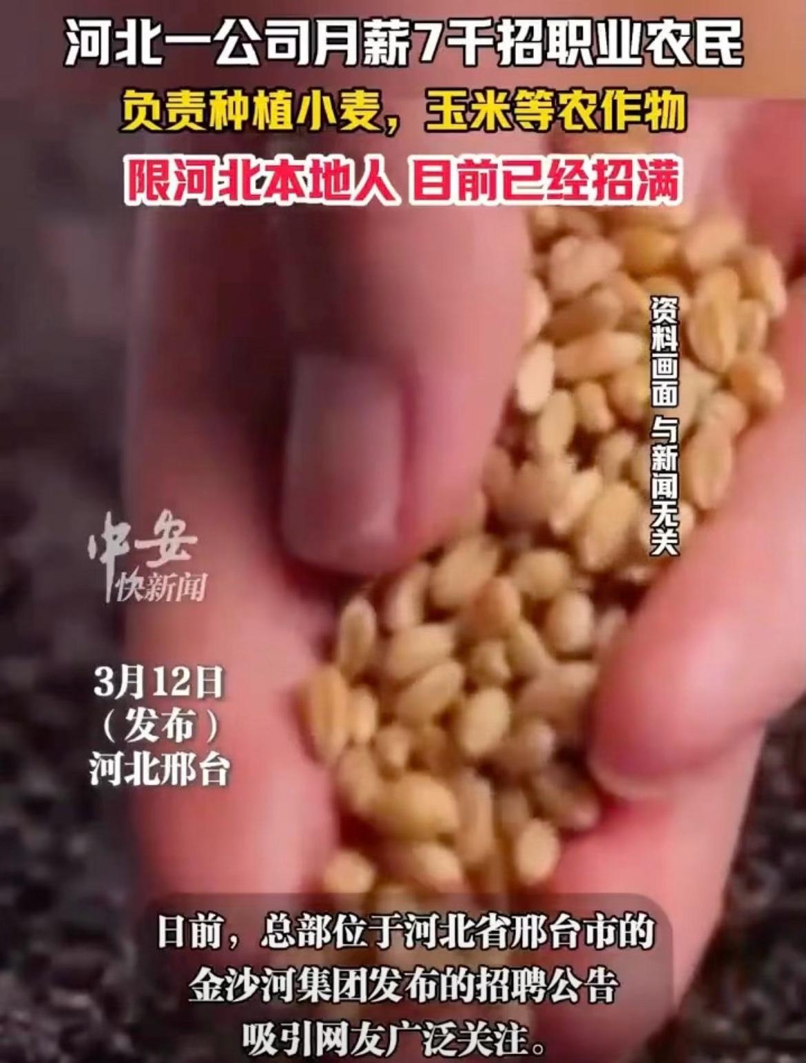 河北一家企业招聘职业农民学员,月薪7000还带外派补助,要求是30到35岁的本地