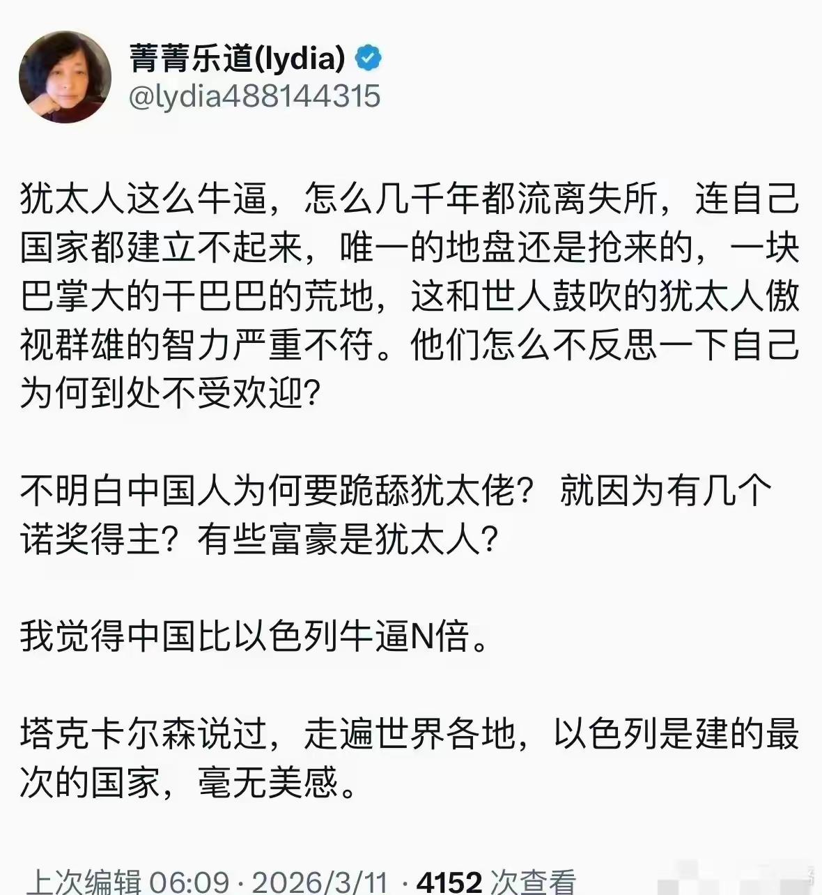 犹太人政策研究所点名批评了中国网络大V卢克文,认为卢克文属于反犹分子。但是卢克文不接受这个指控,他认为他并不是反犹,而是对犹太人祛魅,说白了就是平视犹太人。 这出戏有意思。一个远在万里之外的国外机构,专门盯上咱们中国的网络写手,扣上一顶“反犹”的大帽子。卢克文是谁?靠写国际地缘政治起家,粉丝几千万,文章里确实没少聊犹太人,聊罗斯柴尔德,聊共济会,聊美国背后的金融资本。这回算是捅了马蜂窝。 咱们得先掰扯清楚,什么叫“祛魅”?这词儿听着文绉绉的,其实意思就是把神话扒下来,让你看看里头是啥货色。卢克文干的活儿,说白了就是把犹太人从“世界上最聪明的民族”、“受害者光环”这些神坛上往下拽一拽。 可他这一拽,问题就来了。你一旦质疑犹太人掌握的巨大财富,分析他们怎么在历史中操纵舆论、渗透权力,西方那套政治正确的板子立马就抡过来了。甭管你举多少数据,摆多少历史,只要结论让犹太人脸上无光,那你就是“反犹”。 这事儿背后藏着个特简单的逻辑:有些群体,人家给自己打造了金钟罩,你只能夸,不能碰。碰了,哪怕你觉得自己是客观分析,那也叫犯罪。去年美国高校里,就因为学生批评以色列政策,多少教授丢了饭碗?言论自由的金字招牌,在这儿不好使。 卢克文嘴里的“平视”,恰恰是捅破了那层窗户纸。过去几十年,咱们这儿的舆论场,对犹太人的叙事几乎是清一色的崇拜:诺贝尔奖得主多,金融天才多,家教好,会赚钱。仿佛这是个完美的优等生民族。 可你要是真去翻翻历史书,翻翻他们自己犹太裔学者写的《虚构的犹太民族》,你就会发现,民族叙事本身就是个建构的过程。任何民族都有光辉,也有阴影。只许谈爱因斯坦,不许谈复国主义的暴力,这不是平视,这是跪着看。 现在问题来了,一个以色列背景的所谓“政策研究所”,为啥要跨着半个地球来点名卢克文?他们真的在乎一个中国网民的看法吗?还是说,他们紧张的是,卢克文这种“祛魅”式的写作,正在咱们这儿瓦解他们精心维持了上百年的形象工程? 想想看,如果越来越多的中国人开始用审视其他国家、其他民族的平常心,去审视犹太人在全球资本、媒体、政治中的实际影响力,去追问那些年他们到处建立的游说集团到底在干啥,谁最坐不住?当然是那些靠神秘感活着的人。 所以这场架,压根不是卢克文和犹太民族的私人恩怨。这是一场话语权的争夺。一方想继续维持某种不可触碰的叙事特权,另一方则想用本土化的视角把它拉下神坛。冲突是必然的。 咱们普通人看这事儿,最该想明白的是:凭什么只能他们给全世界立规矩?凭什么只能他们定义谁是“反犹”?咱们能不能用自己的脑子,用自己的眼睛,去重新打量这个世界上的每一个民族、每一种文明? 这才是卢克文那两千多万粉丝真正在琢磨的事。不是要去恨谁,而是要摘下滤镜,看见真实。如果看见真实就是罪,那这罪,可能真就犯大了。 各位读者你们怎么看?欢迎在评论区讨论。