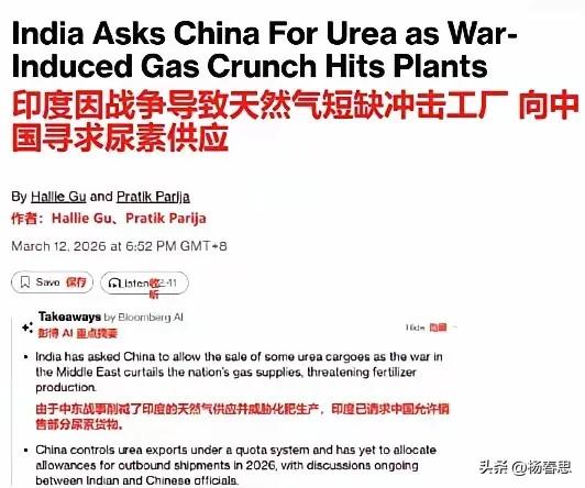 看媒体报道说,印度icon警告中国要放开尿素icon的出口,因为印度需要,印度缺口大。我不知道这是媒体的语气,还是印度的语气啊。但是听起来就很不爽。印度缺少尿素,关中国什么事?中国的尿素也是战略物资啊,特别是现在属于世界不安定动荡的时期,尿素关系到中国的农业丰收,关系到中国的粮食安全。 尿素不能出口给印度,尿素不但可以用于农业,还可以生产炸药,炮弹,妥妥的军民两用物资。 即使卖尿素价格得涨到五~十倍,比国际市场价高一半,先打全款,后给尿素! 求人得有正确姿势, 先跪下, 预付全款, 对了,价格得涨10倍。 15亿人,每天可以产生很多天然尿素,只要在大街上添置一些收集大缸就可以了,不会缺的,大缸,我们可以卖的。 要是印度能卡中国,分分钟让中国窒息死亡。🤦 疫情期间禁止出口大米给中国的是印度。疫情期间,印度率先发起对中国制裁,并向中国索赔20万亿美元,坚决反对向印度出口尿素稀土以及一切战略物资! 我觉得关于像印度,这种开口让中国放开尿素供应,实在是太自以为是、太想当然了。他们根本不懂,战争状态下,化肥、能源、粮食全是战略紧缺物资,全球供应链都会被直接冲击,没有任何一个国家有义务、有责任在自身安全都要绷紧弦的时候,无条件满足别国的需求。 尿素不是普通商品,它直接关系到中国的春耕、粮食安全,是保命的战略物资。现在国际局势动荡,能源价格飞涨,全球化肥供应本就严重短缺,中国首先要保证的是本国农民、本国粮食生产的稳定,这是底线,更是大国生存的基本逻辑。 你缺,是你的问题;我保,是我的责任。难道你缺什么,我就必须开放什么吗? 天下没有这个道理。地缘冲突面前,每个国家都要先顾自己的基本盘,先守自己的粮仓。中国可以在合理、可控、不影响自身安全的前提下酌情考虑,但绝没有被道德绑架、必须供应的义务。 作为超级发达国家的三哥,这种语气同一个发展中国家说话,这符合三哥的气质吗?😄😄三哥应该这样说才有逼格:中国应该无条件满足三哥家春耕生产所需化肥农药等,否则阿琼坦克与光辉战机不是吃素的。😄😄😄