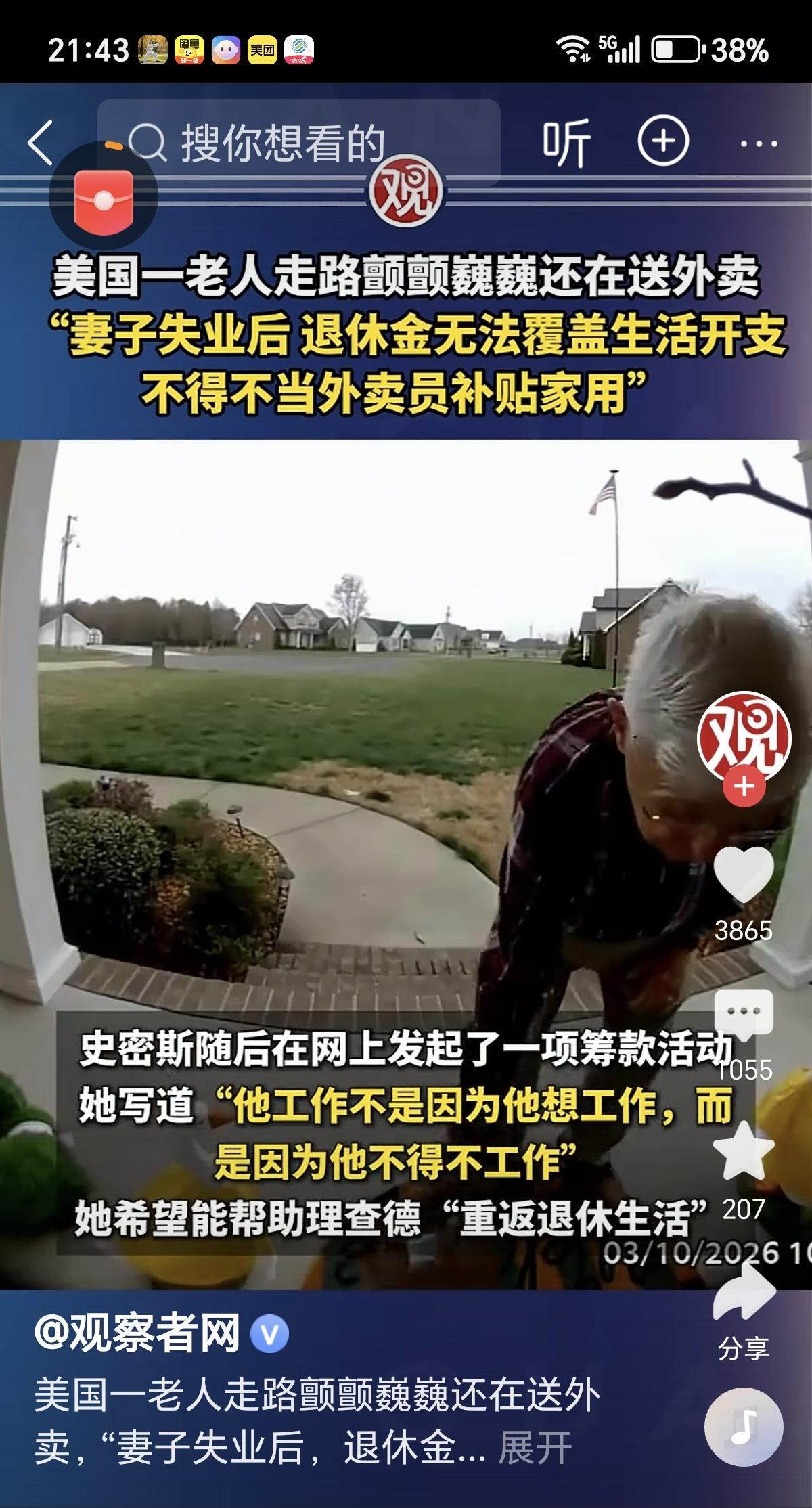 美国老人颤颤送餐的背后,是千万老人的养老困境 耄耋之年,本是颐养天年的时光,美国田纳西州曼彻斯特市的一位老人,却在街头颤颤巍巍地送着外卖。这一幕被监控记录下来,戳中了无数人的心,也撕开了美国养老体系的一道口子。 3月10日的监控画面里,这位退休老人佝偻着身躯,脚步蹒跚,每走一步都带着明显的晃动,却依旧小心翼翼地护着手中的外卖。很难想象,这样一位连走路都费劲的老人,会出现在外卖配送的队伍里。背后的原因,现实又扎心:老人的妻子意外失业,老两口本就不多的退休金,在飞涨的生活成本面前,早已入不敷出。柴米油盐的琐碎,日常开销的重压,让本该安享晚年的老人,不得不放下身段,踏入外卖行业,用这份辛苦钱补贴家用。 谁不想老来无忧?谁愿暮年奔波?可生活的铁拳,从不会因为年纪大就手下留情。这位老人的遭遇,不是个例,而是美国众多普通退休老人的真实写照。当养老的底气被现实磨平,当退休金撑不起基本的生活,老人们只能被迫走出家门,用孱弱的身体换取微薄的收入。有人在超市做着理货的零工,有人在街头做着保洁的工作,还有人像这位老人一样,奔波在送餐的路上,他们的每一次弯腰,每一步前行,都是为了活下去。 此事曝光后,善良的网友纷纷伸出援手,有人发起了众筹活动,原本目标2万美元的筹款,最终收获了近28万美元的爱心捐赠。一笔笔捐款,是陌生人的善意,是对老人的心疼,也让这位老人暂时摆脱了生活的窘迫。可这份温暖,终究只是昙花一现的慰藉。28万美元能解一位老人的燃眉之急,却救不了那些还在养老困境中挣扎的千万老人,更填不满美国养老制度的漏洞。 都说养老是社会的良心,一个国家的温度,藏在对老年人的态度里。美国作为标榜发达的国家,其养老体系却早已千疮百孔。退休金的涨幅追不上通货膨胀的速度,医疗、住房等生活成本居高不下,社会保障的网,漏下了太多普通的老人。一场失业,一次疾病,就能轻易压垮一个退休家庭。那些看似能提供生计的零工岗位,更是毫无保障可言,没有劳动合同,没有社保福利,老人们干着最辛苦的活,却拿着最微薄的薪水,甚至连基本的安全保障都没有。 老人们辛苦一生,为社会的发展付出了青春和汗水,临了却要为生计奔波,这本身就是一种悲哀。众筹的善举值得肯定,它让我们看到了人性的美好,但慈善从来都不是解决社会问题的根本办法。真正的养老保障,从来都不是靠陌生人的善意施舍,而是靠完善的制度兜底,靠稳定的社会保障体系撑腰。 当一个社会的老人,需要靠送外卖来续命,需要靠众筹来生活,这样的制度,早已失去了本该有的温度。这位送餐老人的背影,不仅是一个家庭的无奈,更是对美国养老制度的无声拷问。养老这件事,容不得半点敷衍,它关乎每一个人的未来,也关乎一个社会的底色。唯有筑牢制度的防线,让退休金真正能撑起老人的晚年,让社会保障能为每一位老人遮风挡雨,老人们才能真正拥有老有所养、老有所依的生活,这样心酸的画面,才不会一次次出现在大众的视野里。 而这一幕,也让我们更加珍惜当下的养老保障体系,懂得完善的社会保障,才是每一个人晚年生活最坚实的依靠。 外卖老人